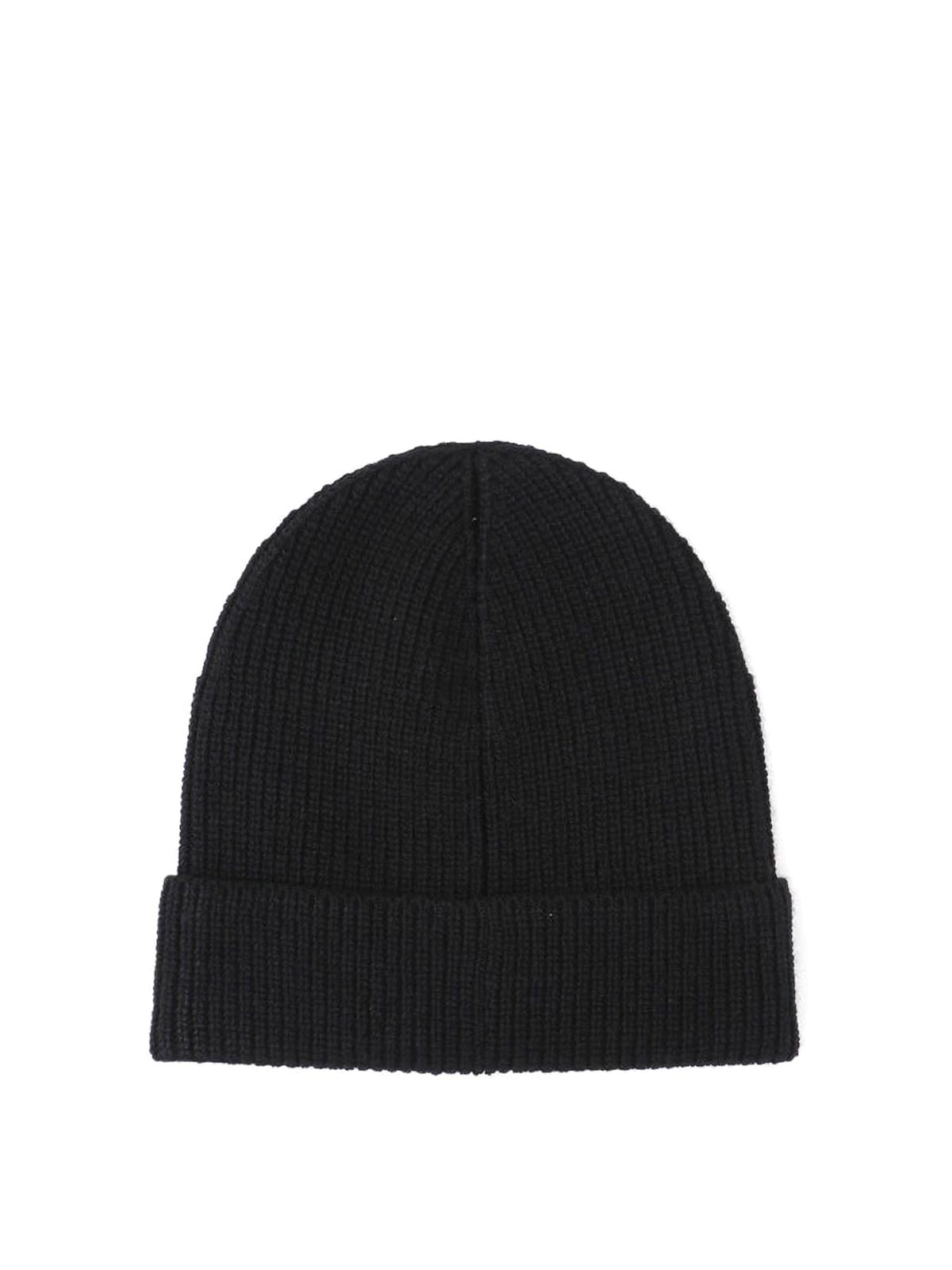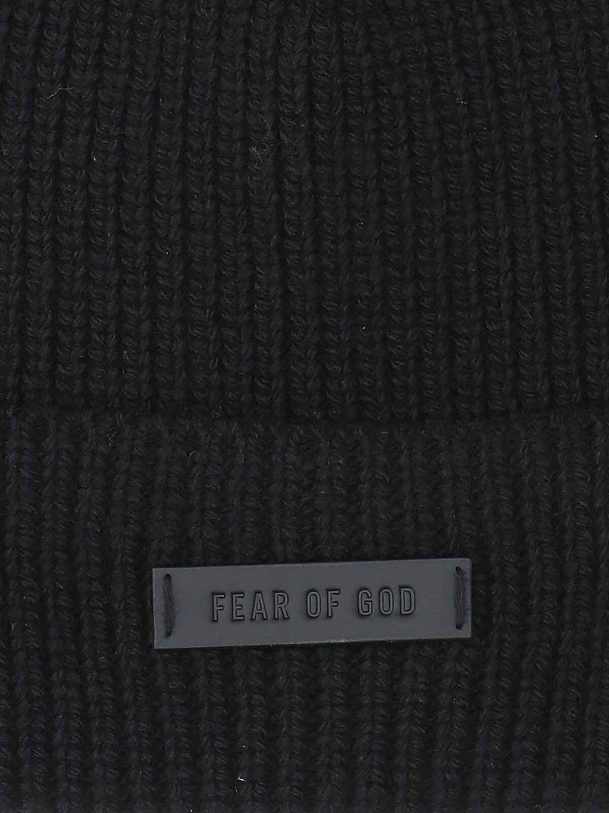 Bonnet en laine mérinos Fear of God, noir, maille côtelée, écusson logo en cuir ton sur ton sur ton sur le devant.