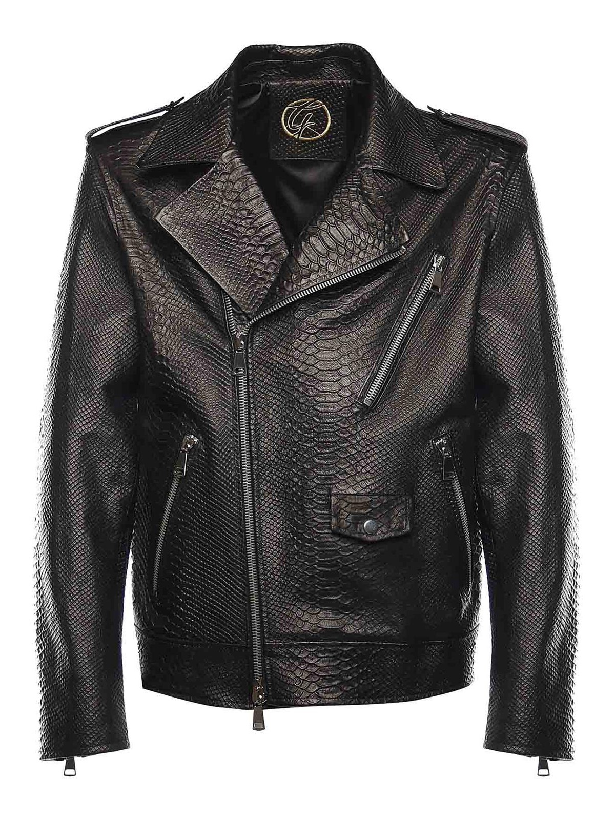 fermeture zippée sur le devant, trois poches zippées en diagonale, une poche à rabat, poignets zippés, coupe classique, la taille montrée sur la photo est 48, fabriquée en Italie, couleur : noir
