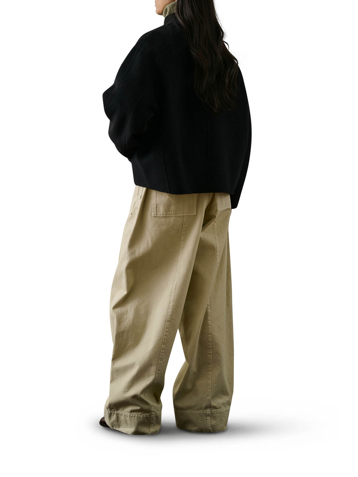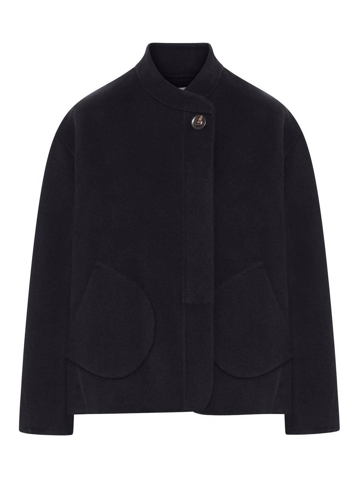 Manteau court, ample et ajusté, manches longues arrondies, montant asymétrique, col montant, cache-cœur, ouverture avec demi-boutons cachés, poches plaquées, double face, couleur noire