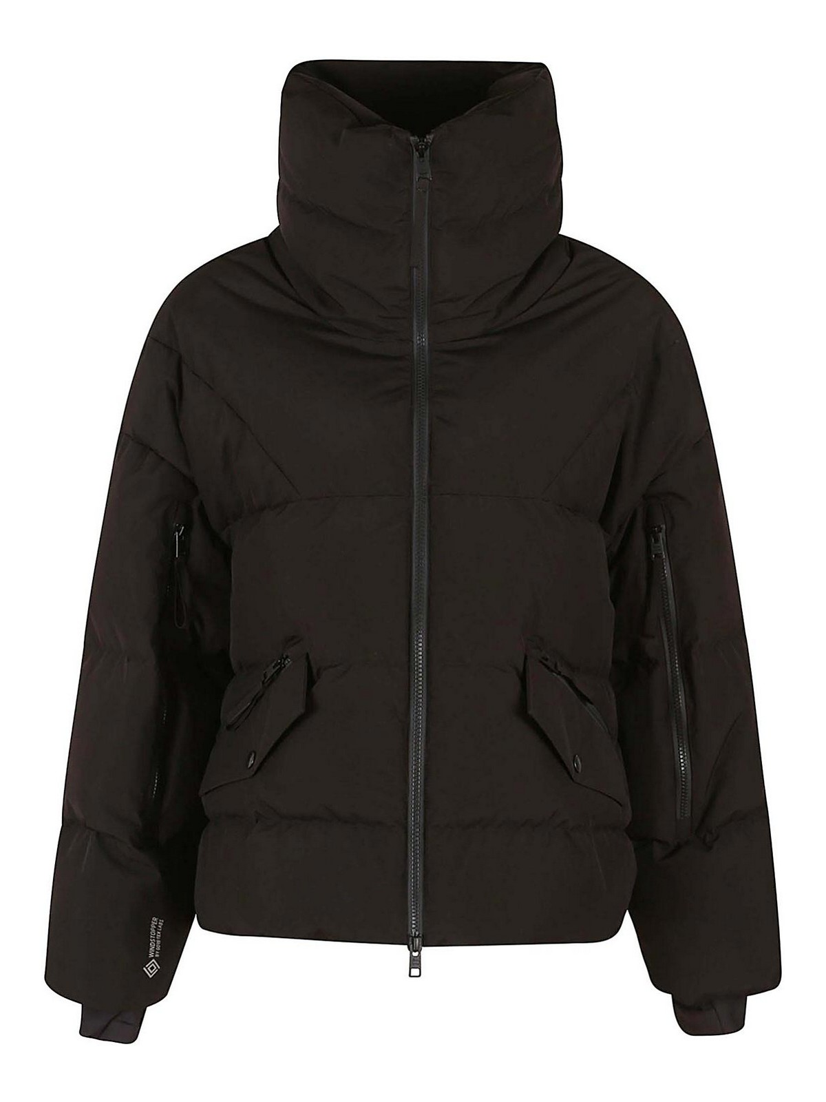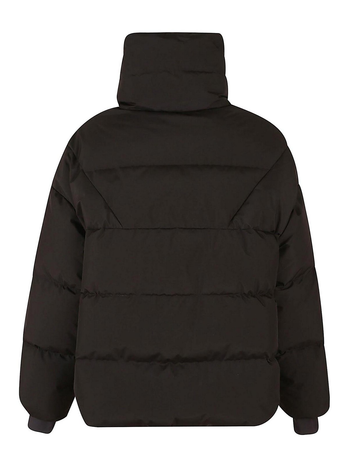 Veste en nylon noir, fermeture zippée, poches à rabat et fermeture éclair, fermeture éclair sur les manches, poignets coupe-vent, cordon de serrage en bas, rembourrage en duvet de canard.