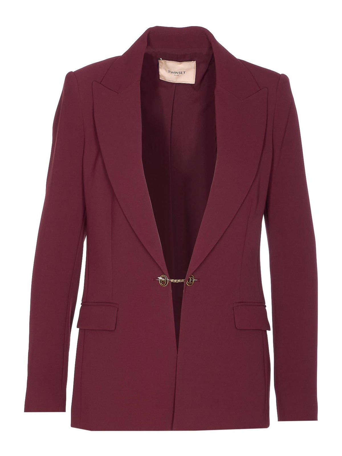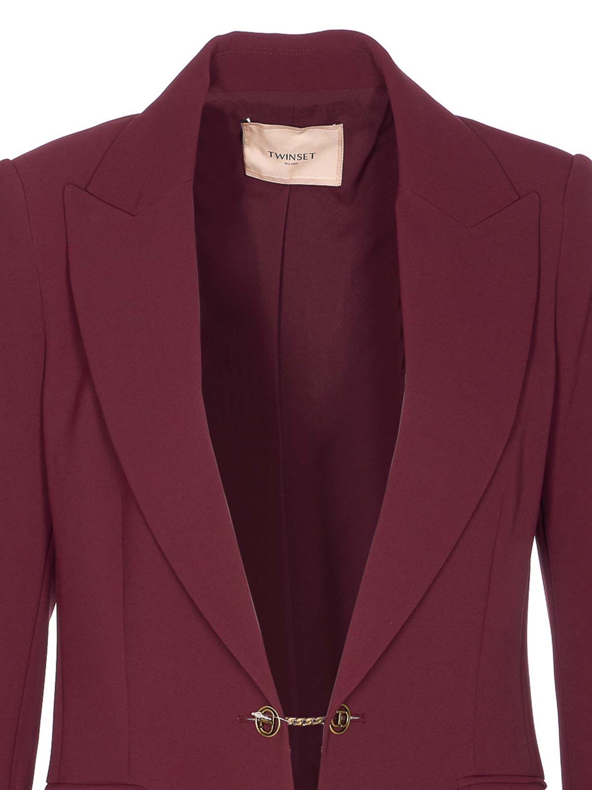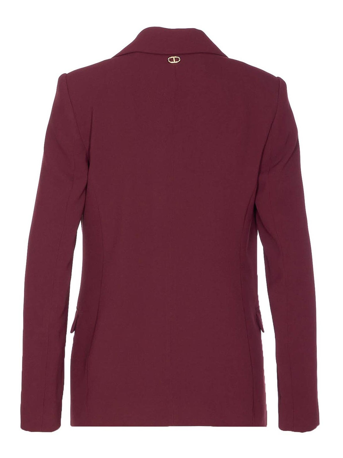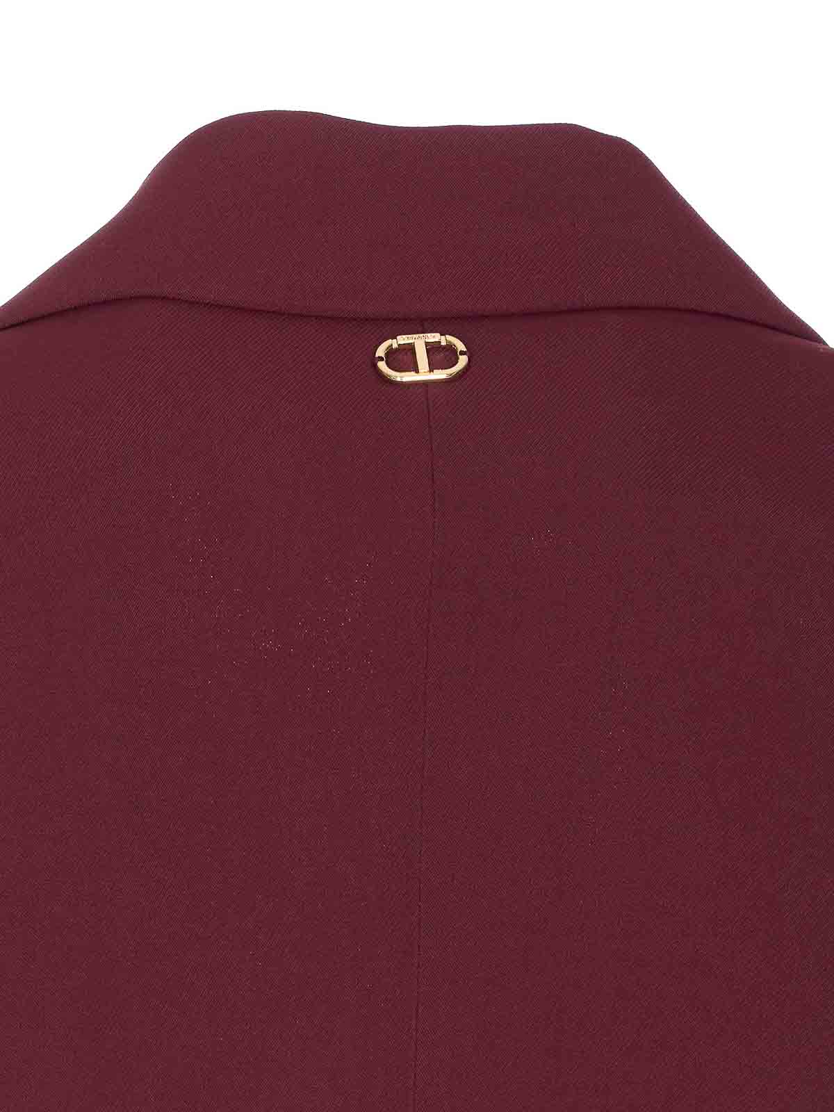 Veste bordeaux Twinset avec fermeture boutonnée à logo frontal, col en V, détail inversé, manches longues, épaule renforcée