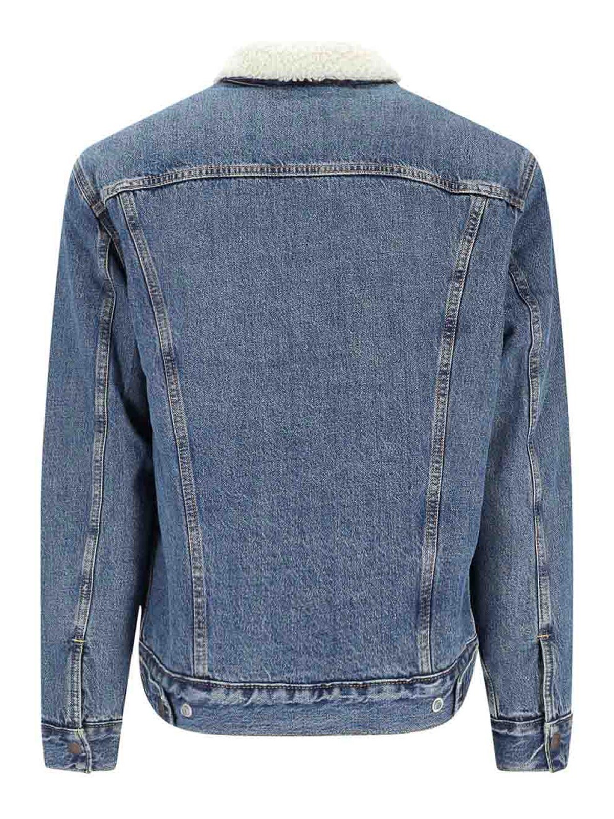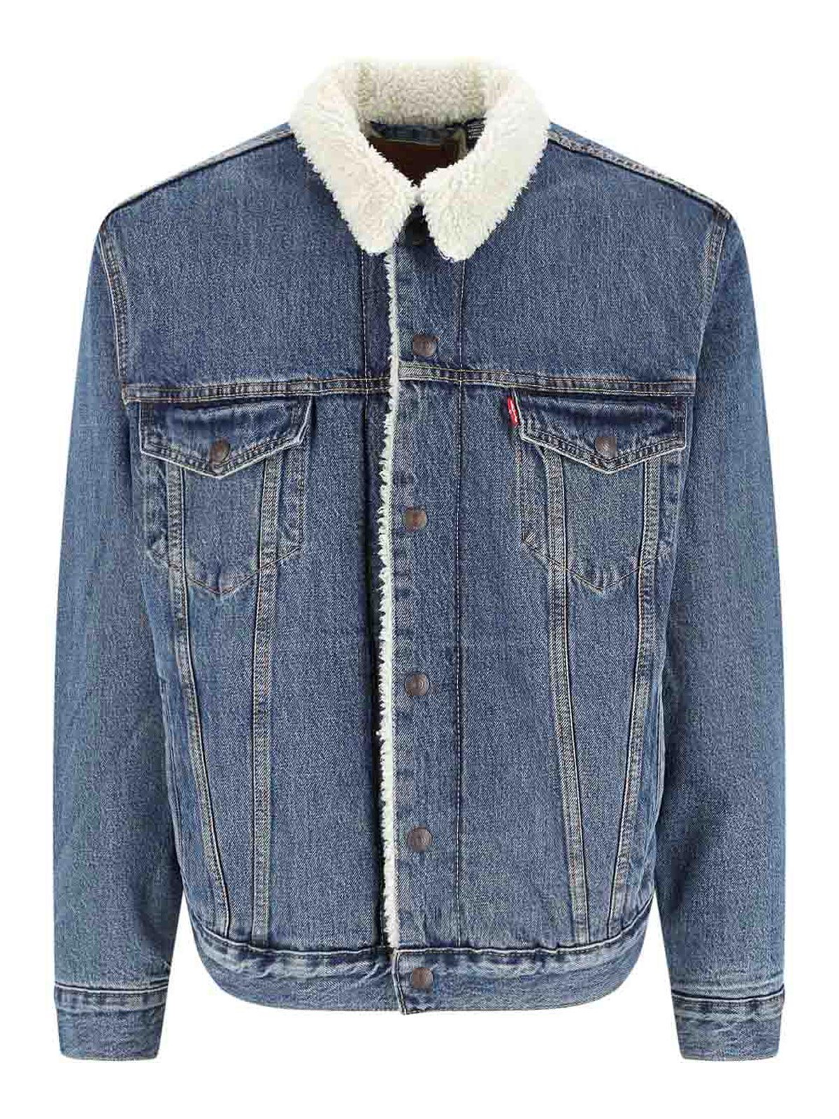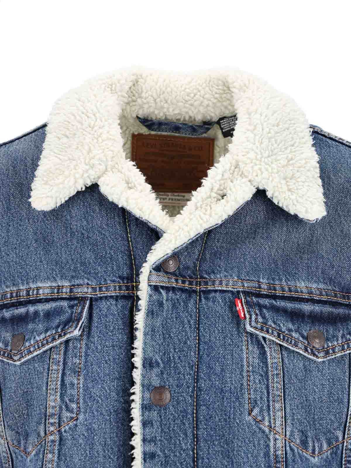 Veste Sherpa Levi's Strauss, en denim de coton bleu clair, doublure en teddy contrastante, col classique, fermeture boutonnée, deux poches boutonnées sur le devant, deux poches latérales, écusson logo rouge sur le devant, boutons réglables à la taille, boutons de poignets, ourlet droit.