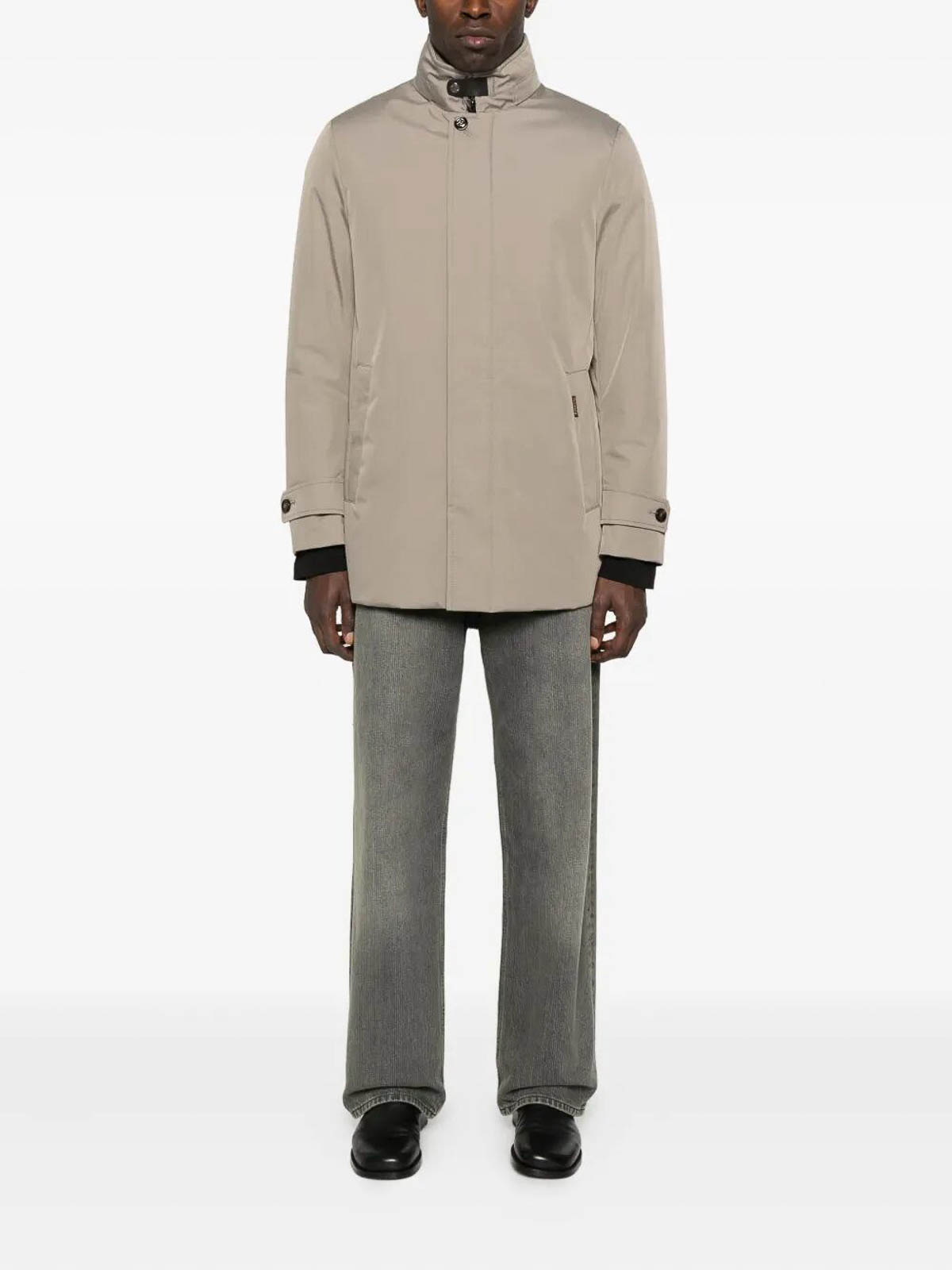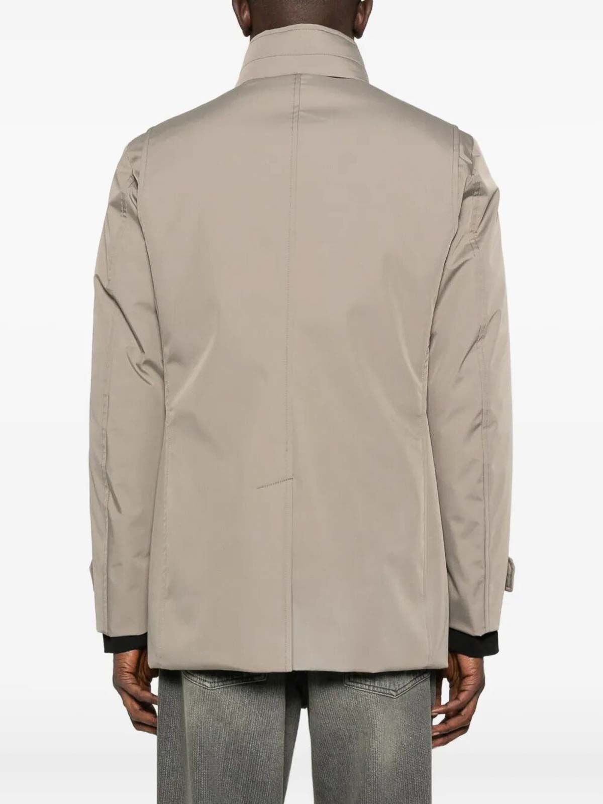 Taupe, col haut, fermeture avant cachée, poches latérales passepoilées, manches longues, poignets boutonnés