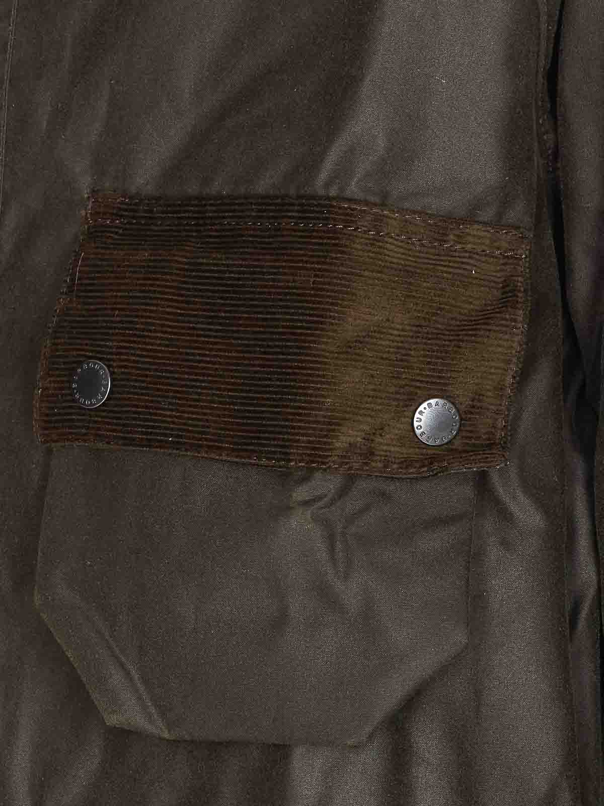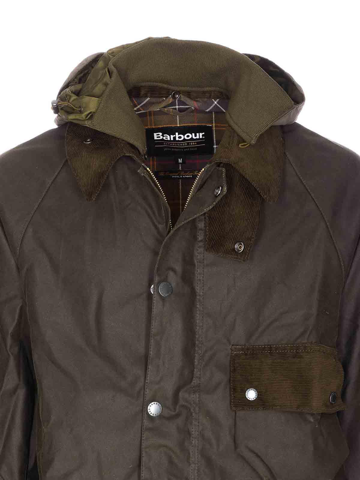 Veste en wax modifié Barbour olive avec fermeture zippée et boutonnée, manches longues, capuche amovible, poches à fermeture boutonnée, logo brodé sur le devant