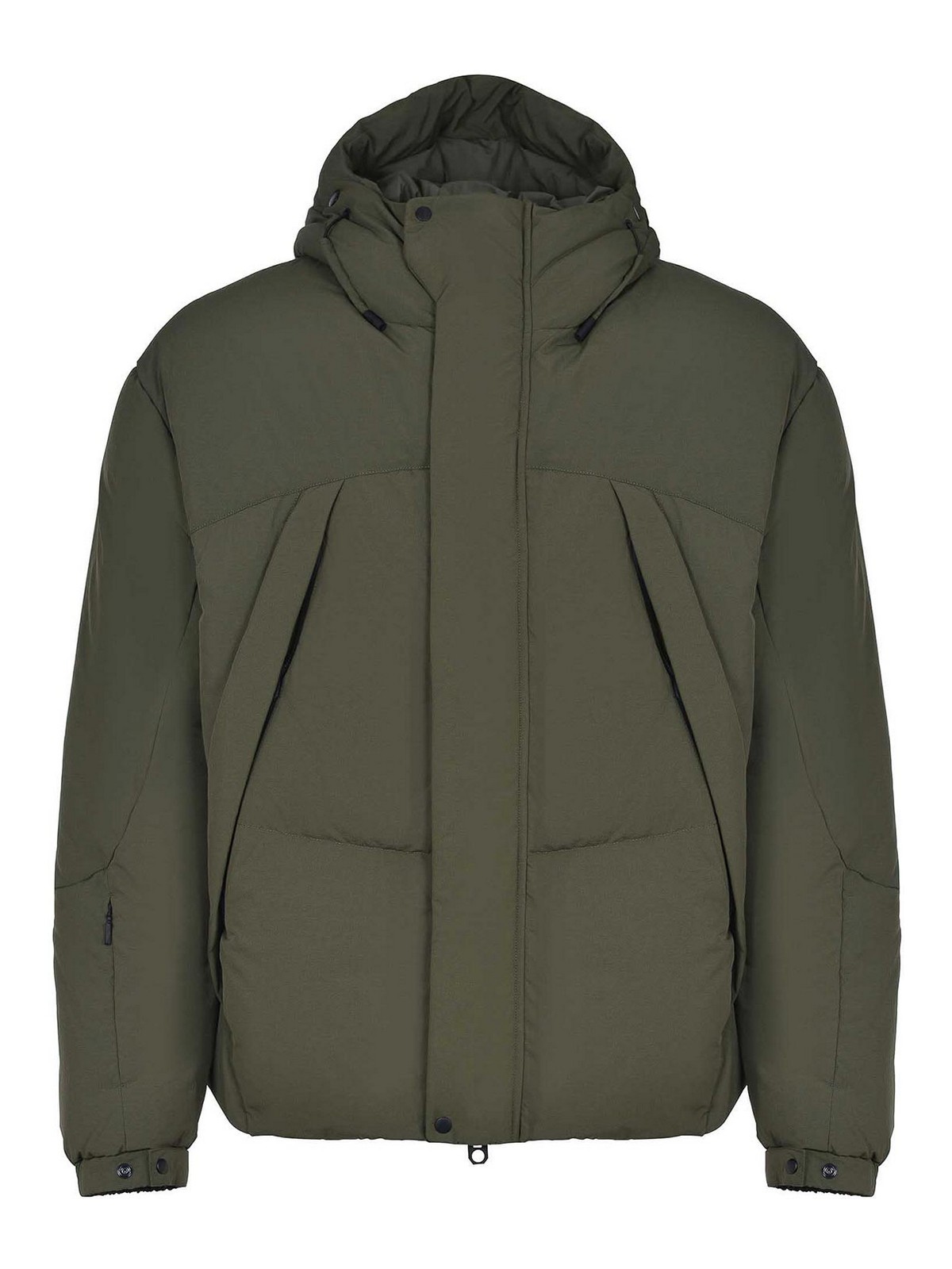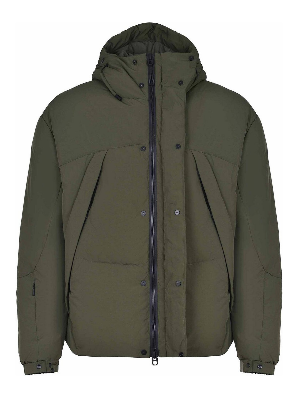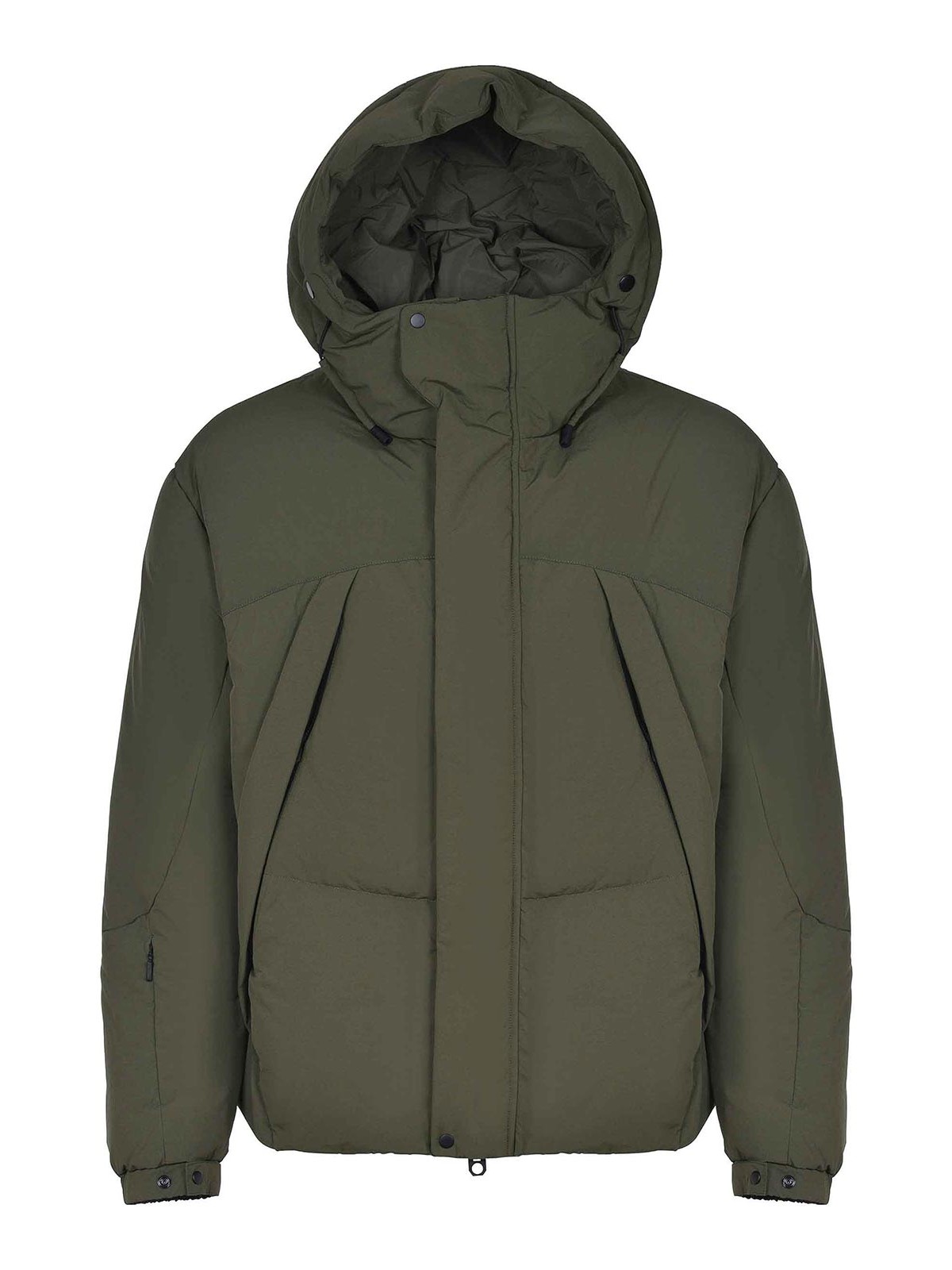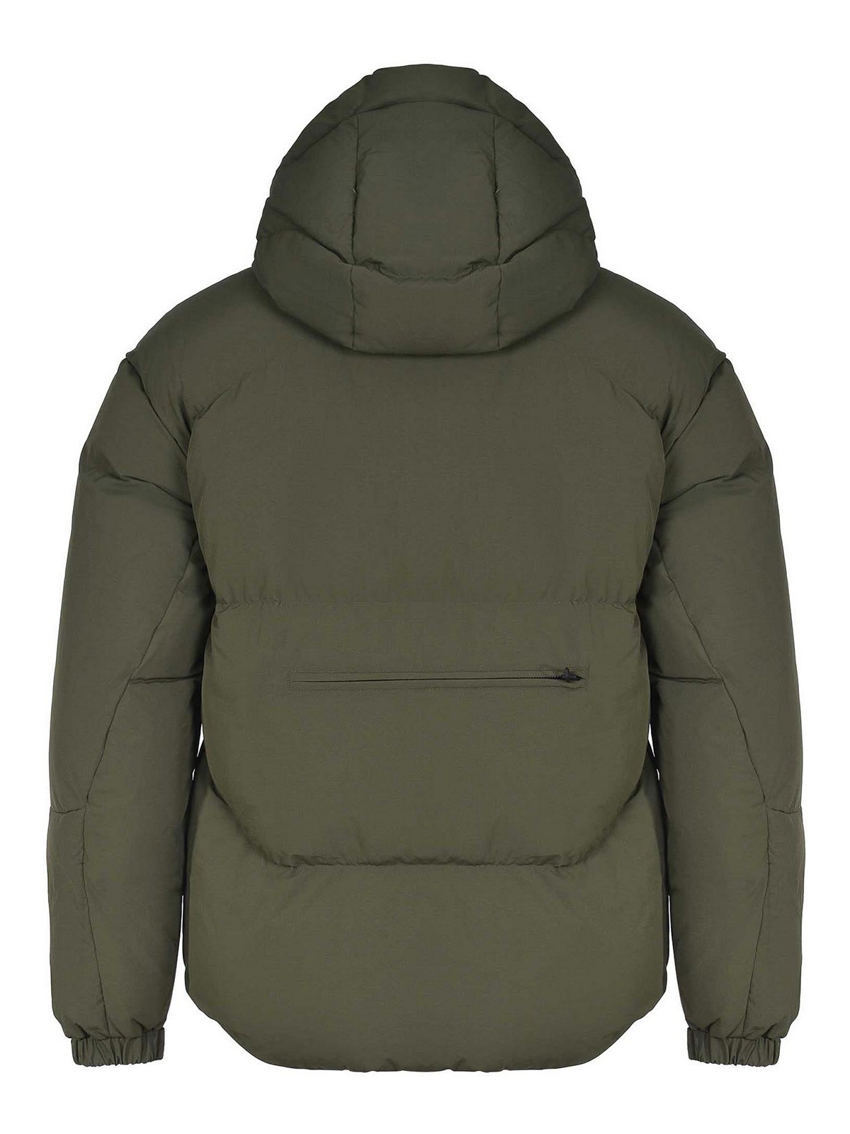 Veste Jg1 en nylon vert militaire. capuche ajustable et amovible avec fermeture éclair sur le col. fermeture par boutons et fermeture éclair à double curseur cachée par un rabat. grandes poches avant. manches longes. poignets élastiques et ajustables. poche zippée sur la manche droite. poche zippée au centre du dos. résistant à l'eau. 100 % polyamide.