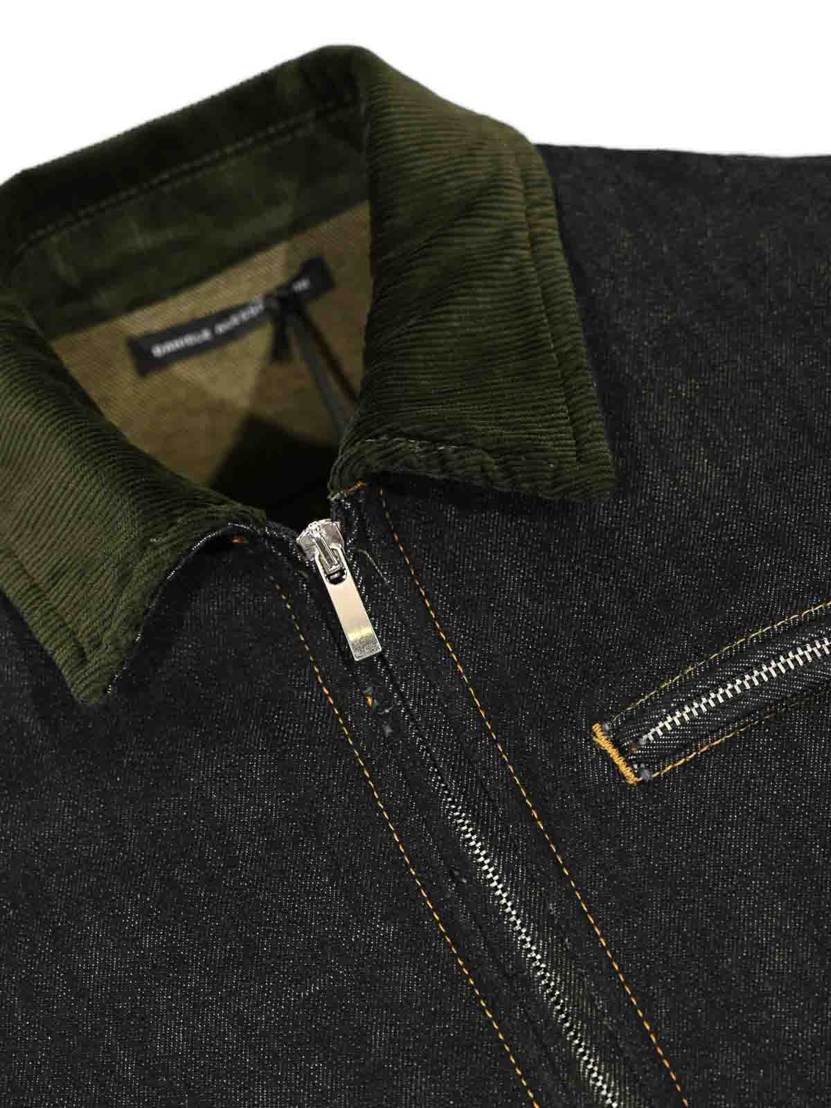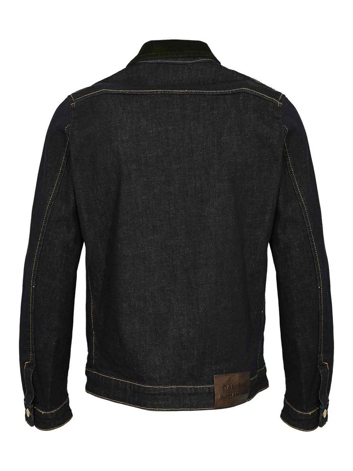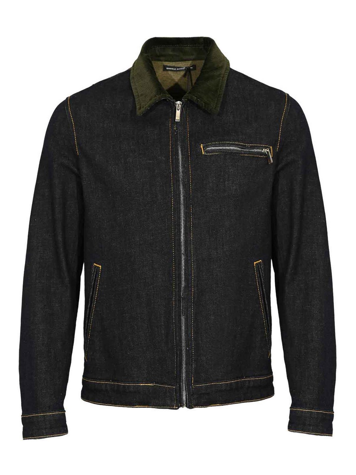 veste en jean Daniele Alessandrini Tissu : coton Denim Motif : denim bleu foncé uni avec surpiqûres contrastantes Manches : longues avec poignets boutonnés réglables Col : velours côtelé vert classique Fermeture : pleine longueur poches frontales zippées : deux poches latérales encastrées et une poche poitrine zippée Détails : coutures contrastantes couleur moutarde, patch logo au dos, intérieur doublé, fermeture éclair métallique sur le devant : oui coupe : classique