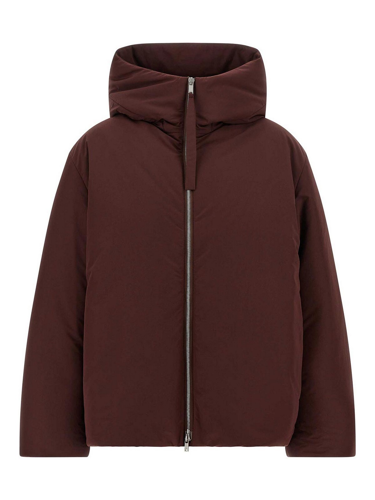 jacket in water, repellent technical with goose side 'jil sander+' logo patch hood high neck zip pockets long sleeves with dropped shoulders