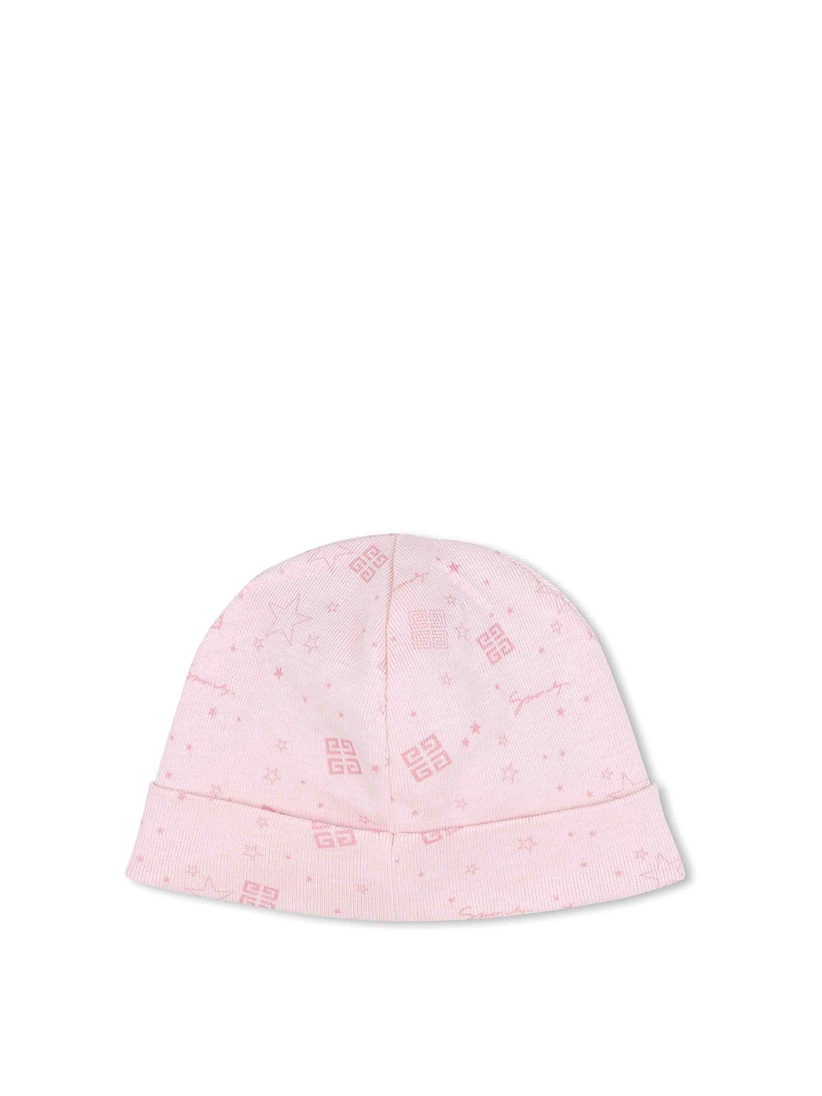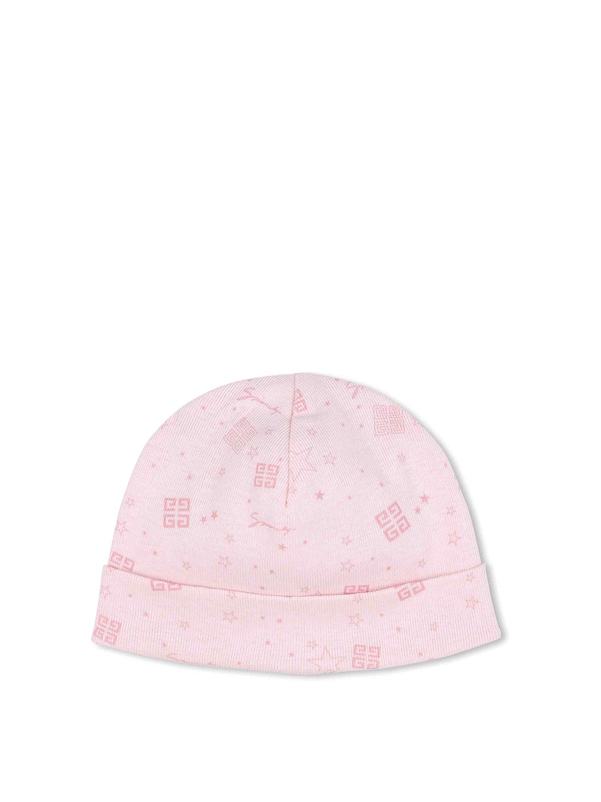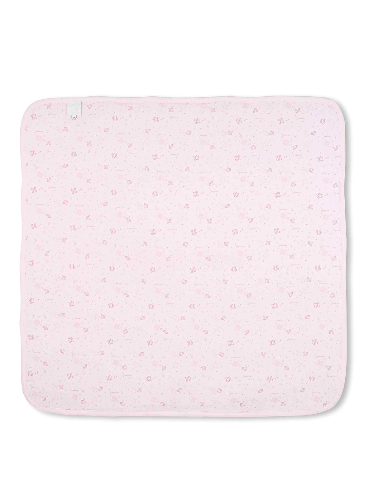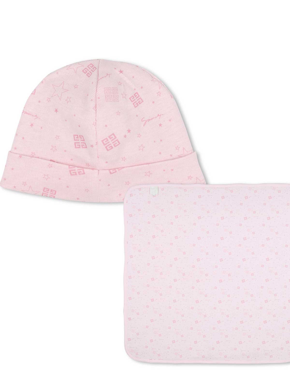 Pink hat + blanket set with all-over graphic print, double layer design, stitching detail, logo detail