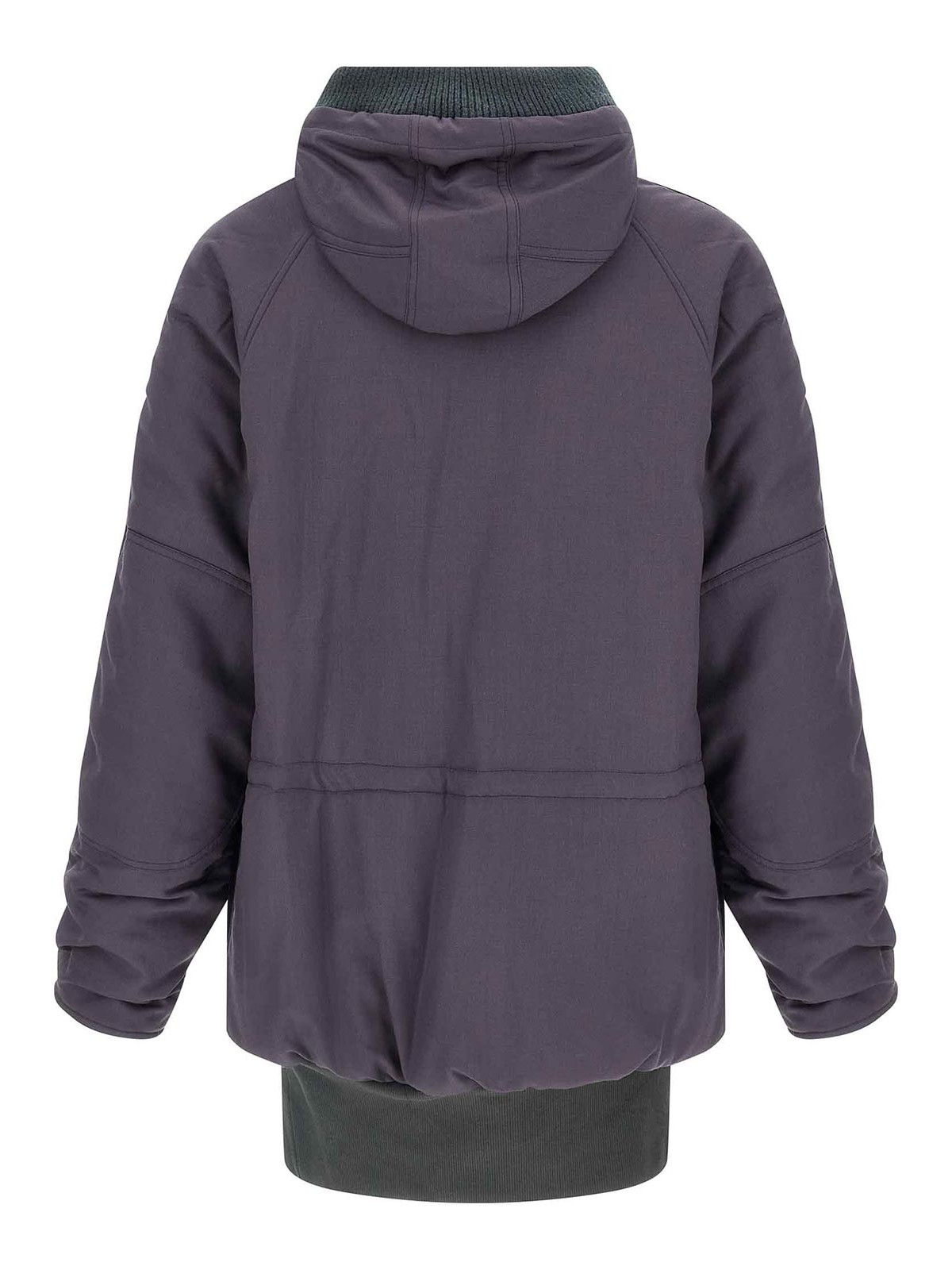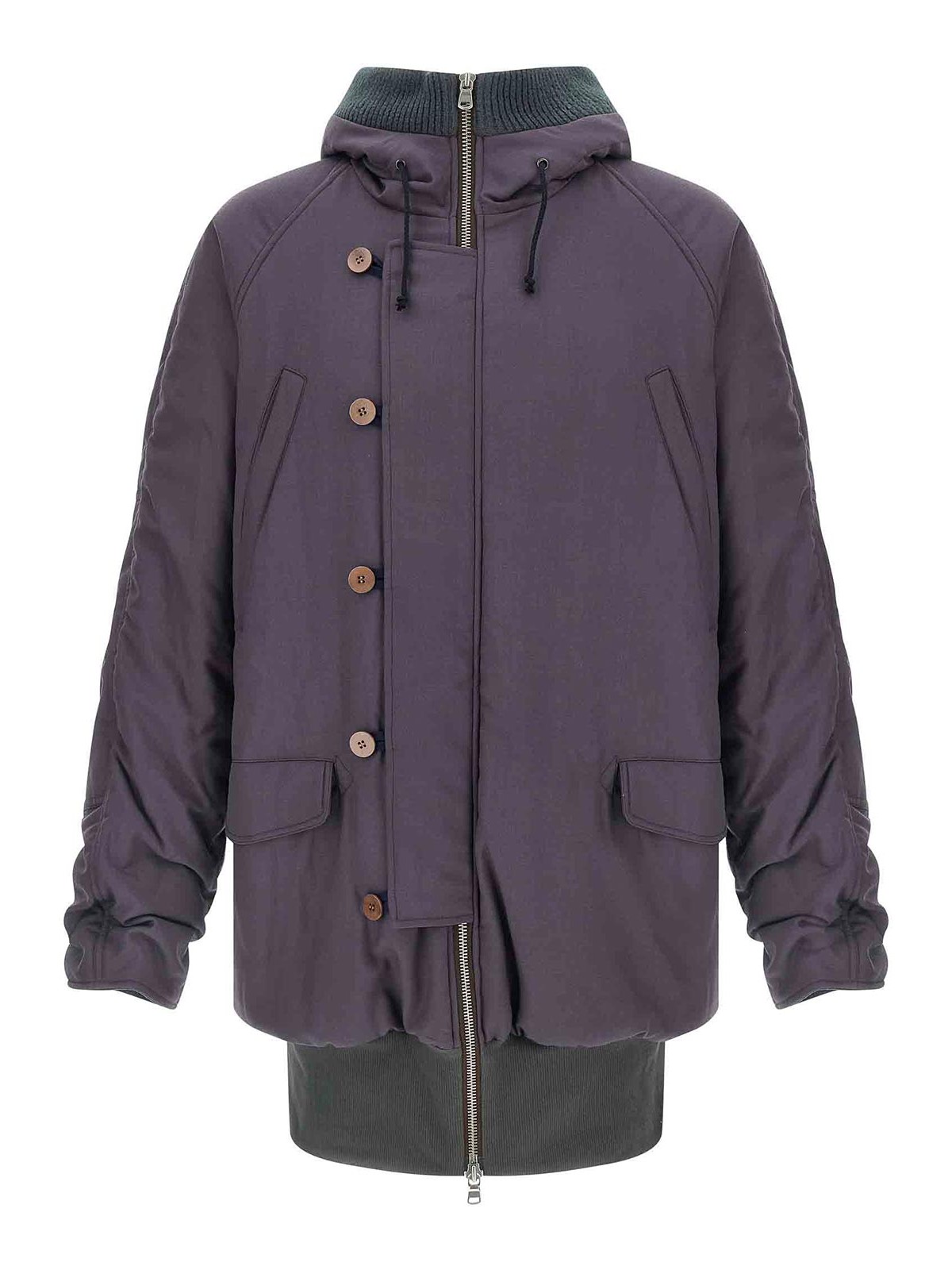 Virgin wool 3/4 kenny parka with contrast ribbed knit details, padded cotton lining, adjustable hood, other collar, front zip and button closure, pockets, long sleeves with inner cuffs, and headband.