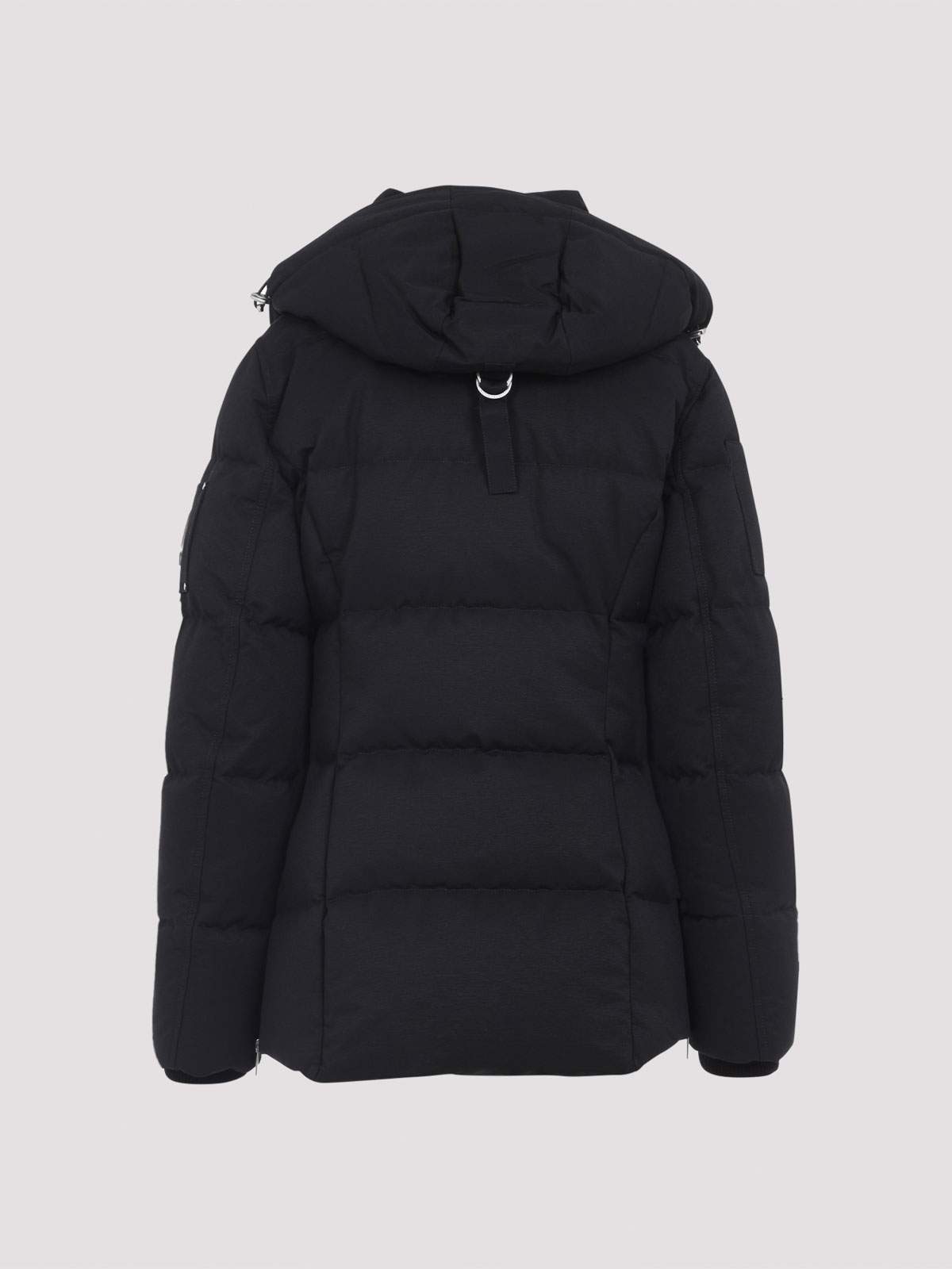 Moose knuckles black cotton q lds jacket crafted and blend detachable tonal hood stand, up collar zipped buttoned chest zipped pocket side flap buttoned pockets long sleeves signature logo on the right zipped pocket on the left ribbed cuffs straight hem padded design detachable furry for the hood
