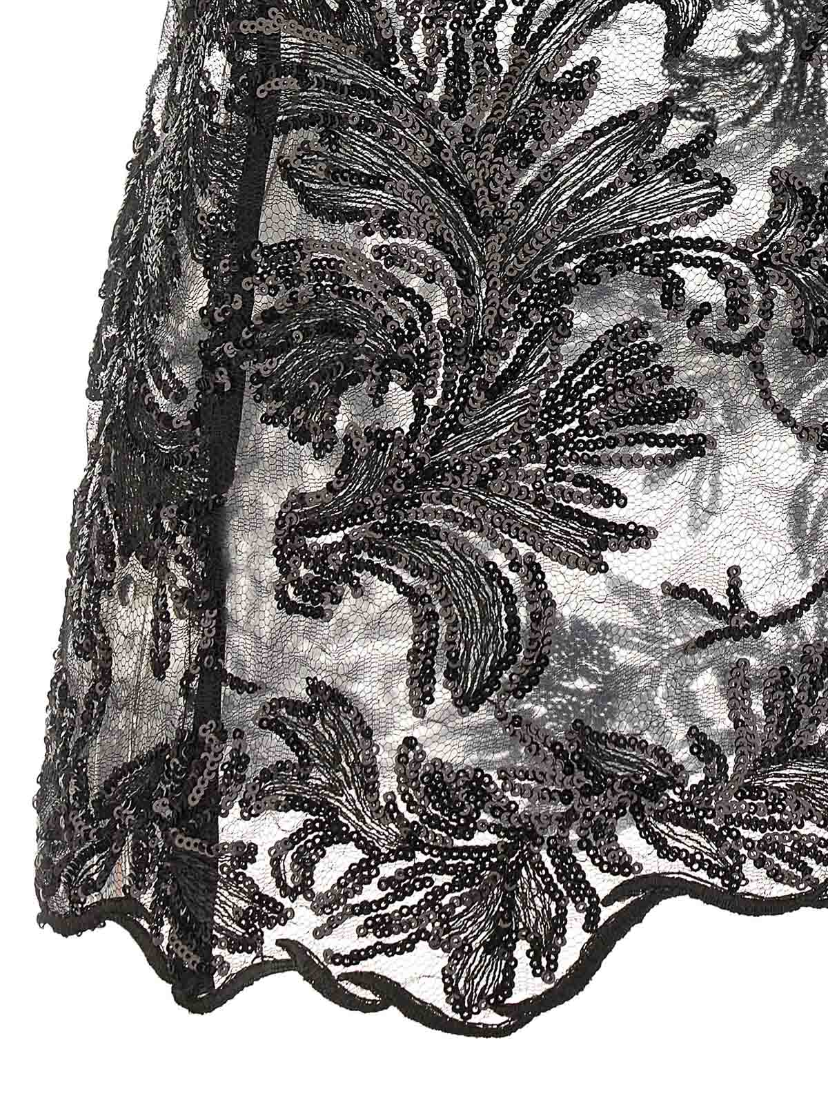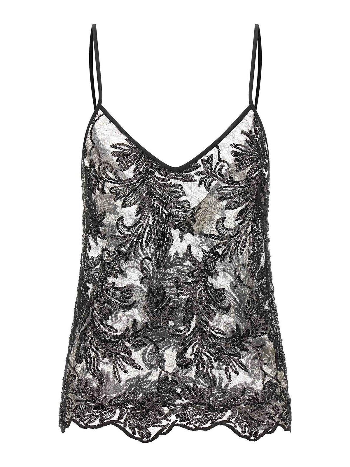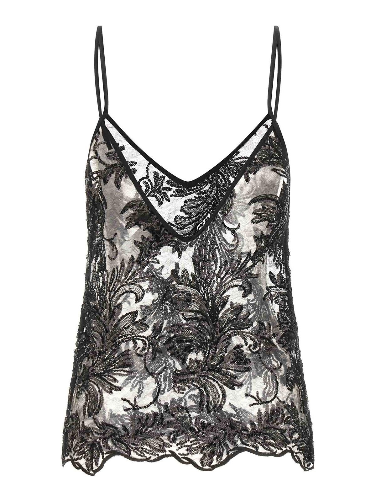alba' semi-transparent lace top with sequin appliqu, wide v-neck front and back, thin straps, and asymmetrical hem.