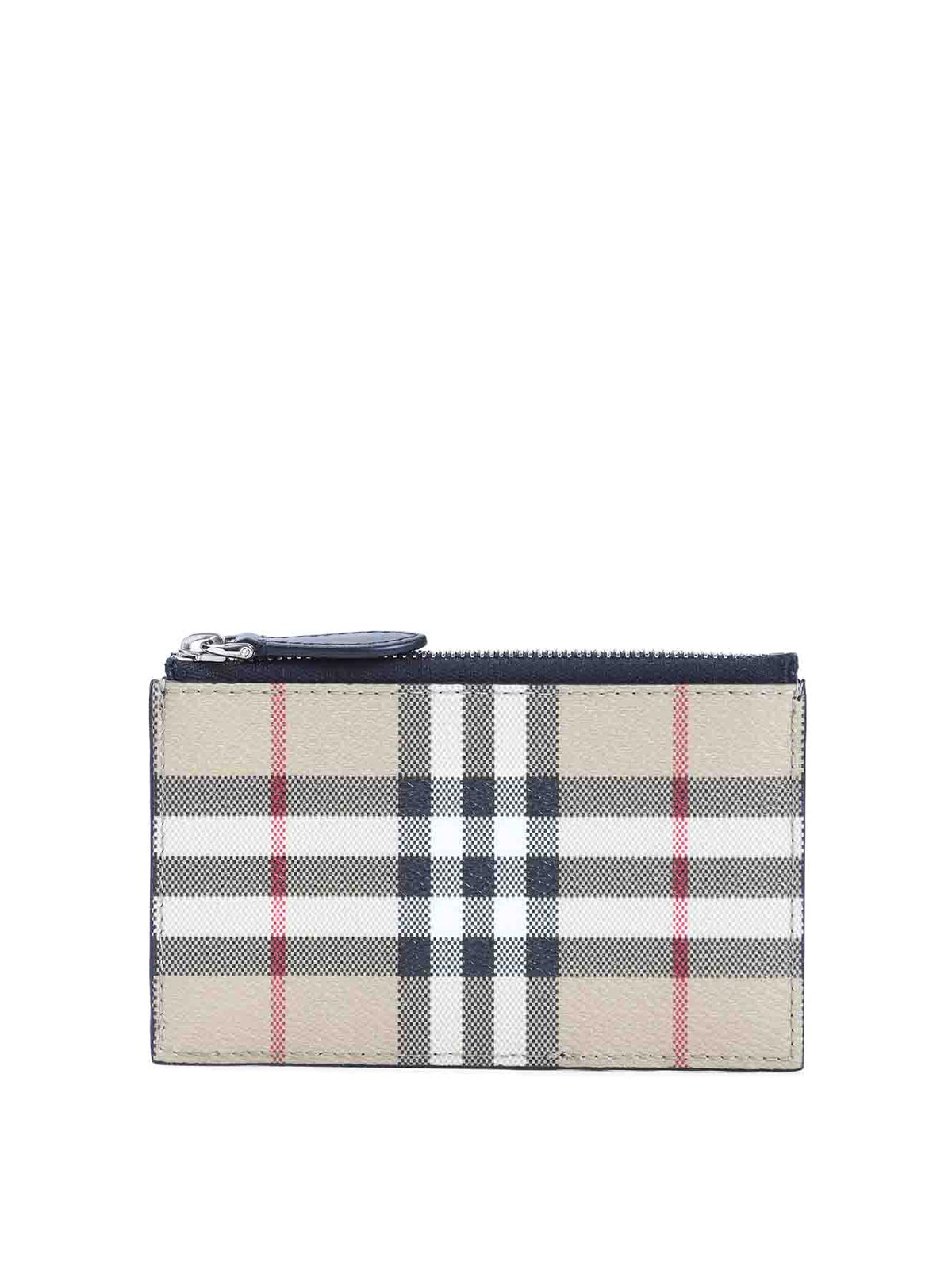 Burberry alwyn beige credit card case crafted from archive beige check and black, toned hardware top zip five card slots on the back