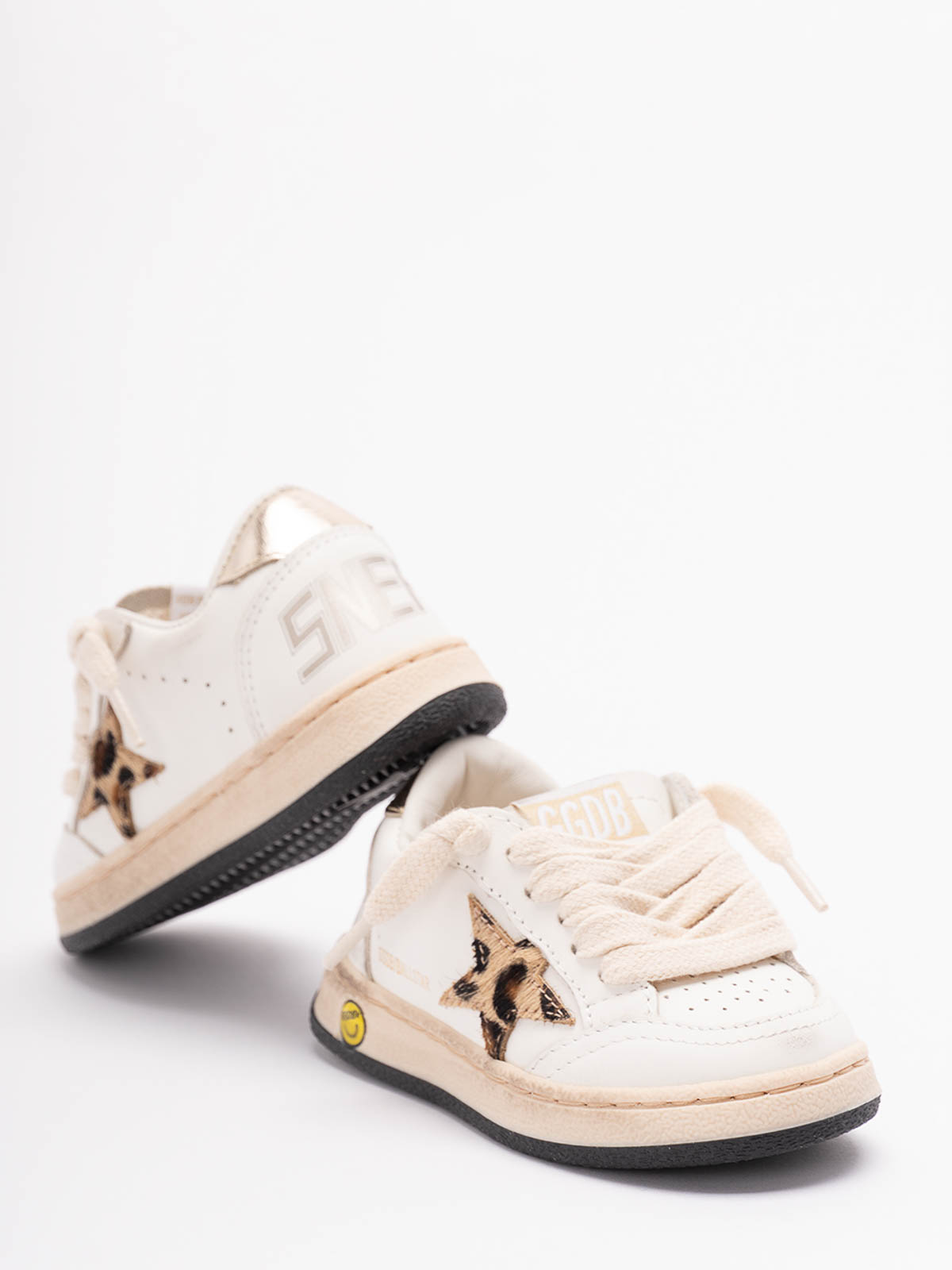 Golden Goose Kids 'Ball Star' sneakers combine a chic white base with brown and black leopard print accents, made in Italy, these stylish shoes are designed for comfort and style