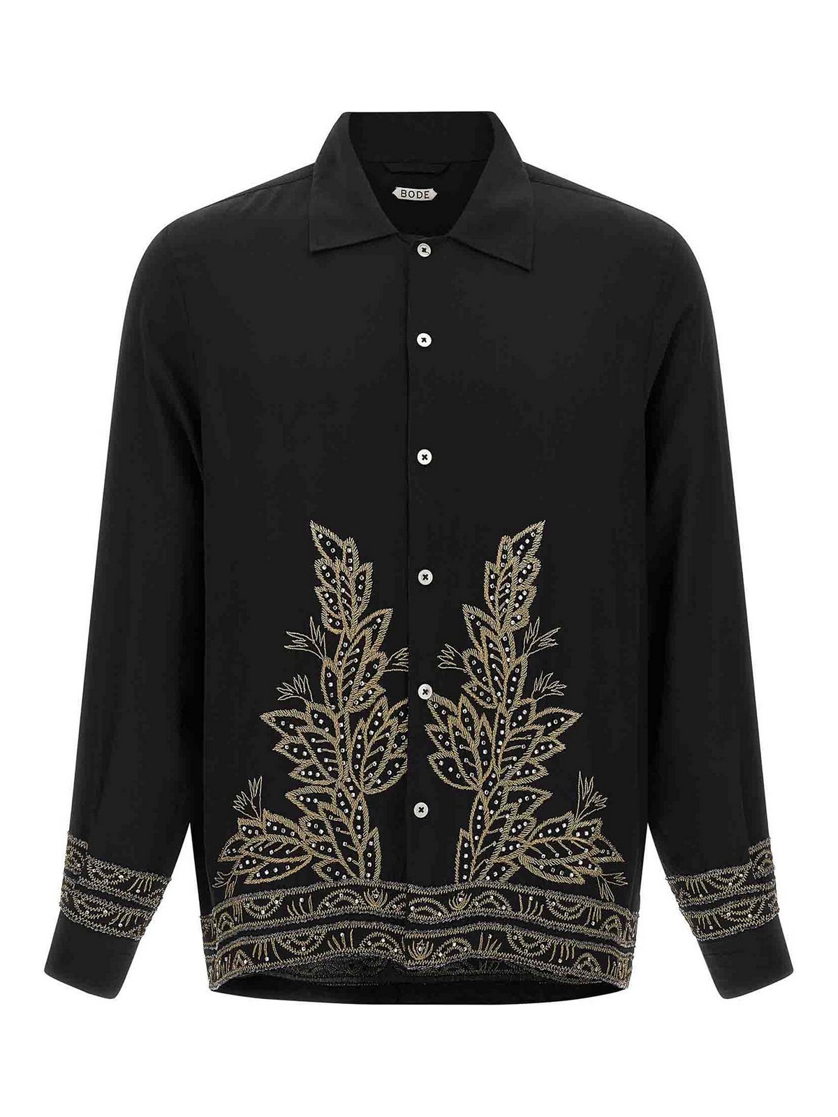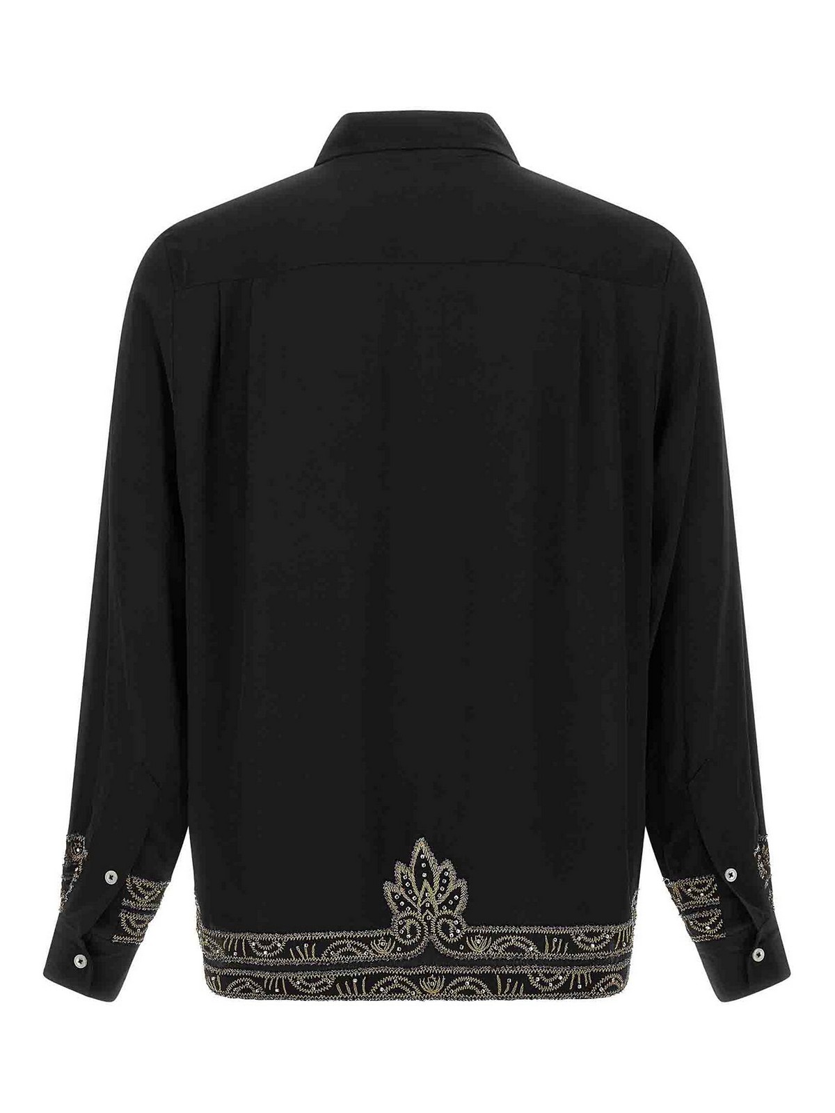 beaded epoque' silk shirt with crystal rhinestones and gold embroidery, front button closure, long cuffed sleeves.