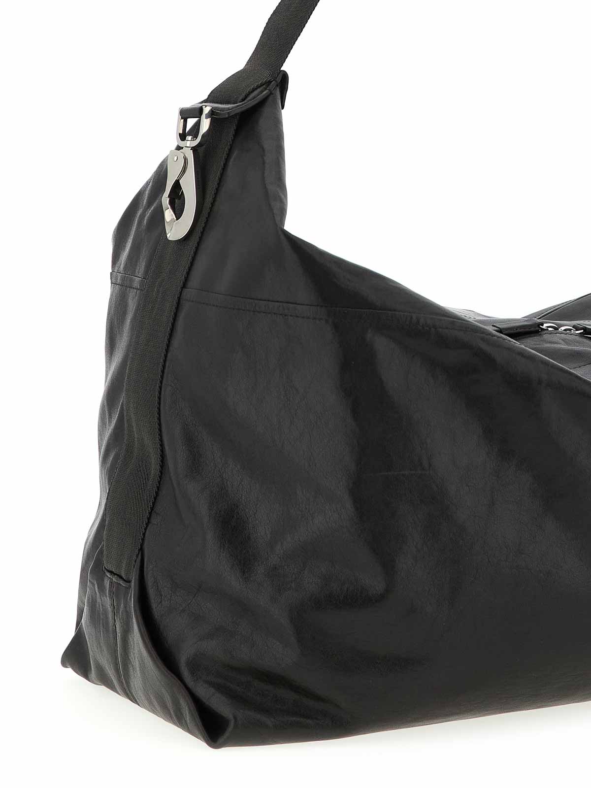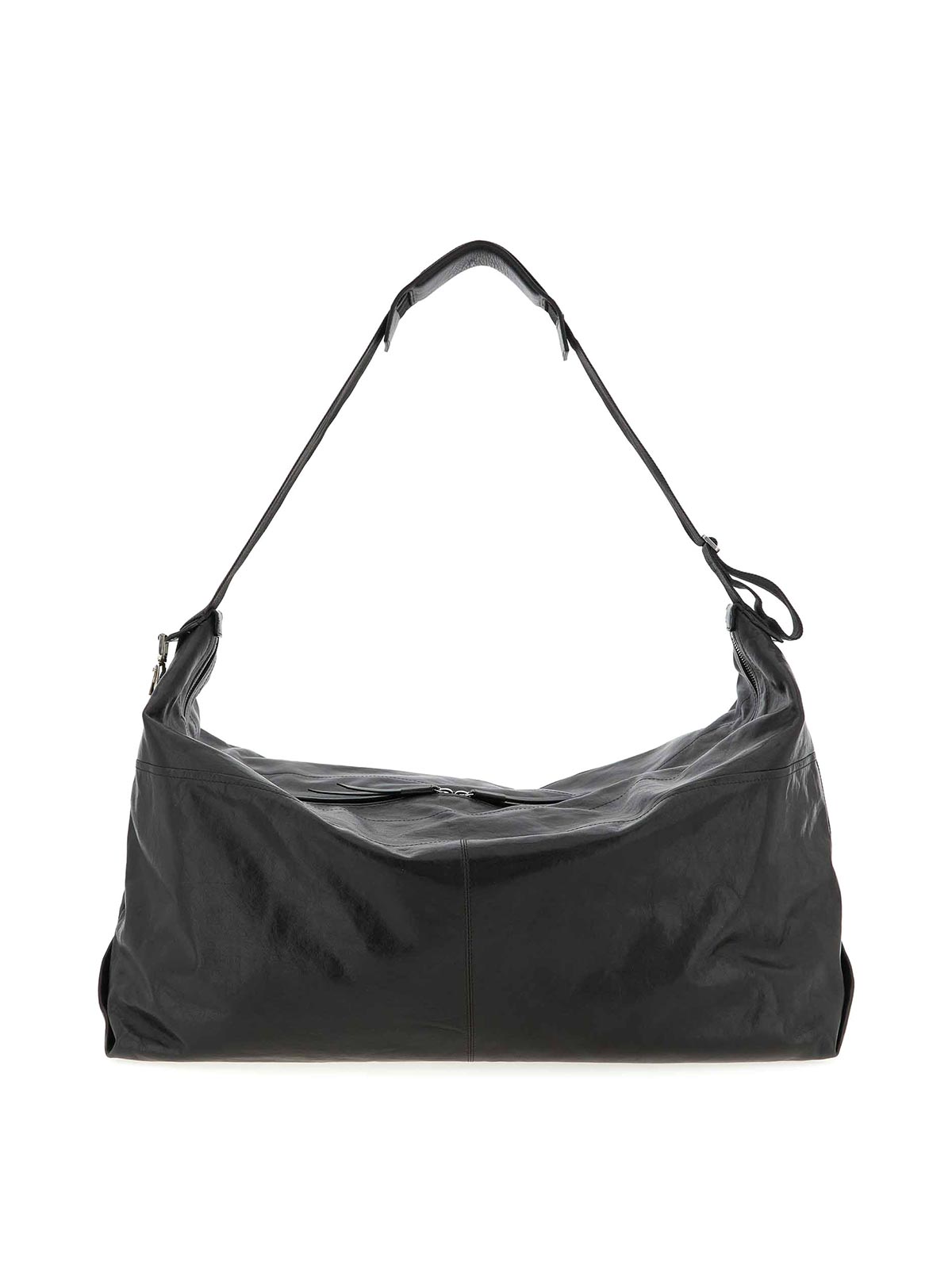 Berlingot 72h weekend' leather shoulder bag with glossy effect treatment, adjustable nylon shoulder strap with metal buckle, sliding leather reinforcement, zip closure, metal side buckle with logo.