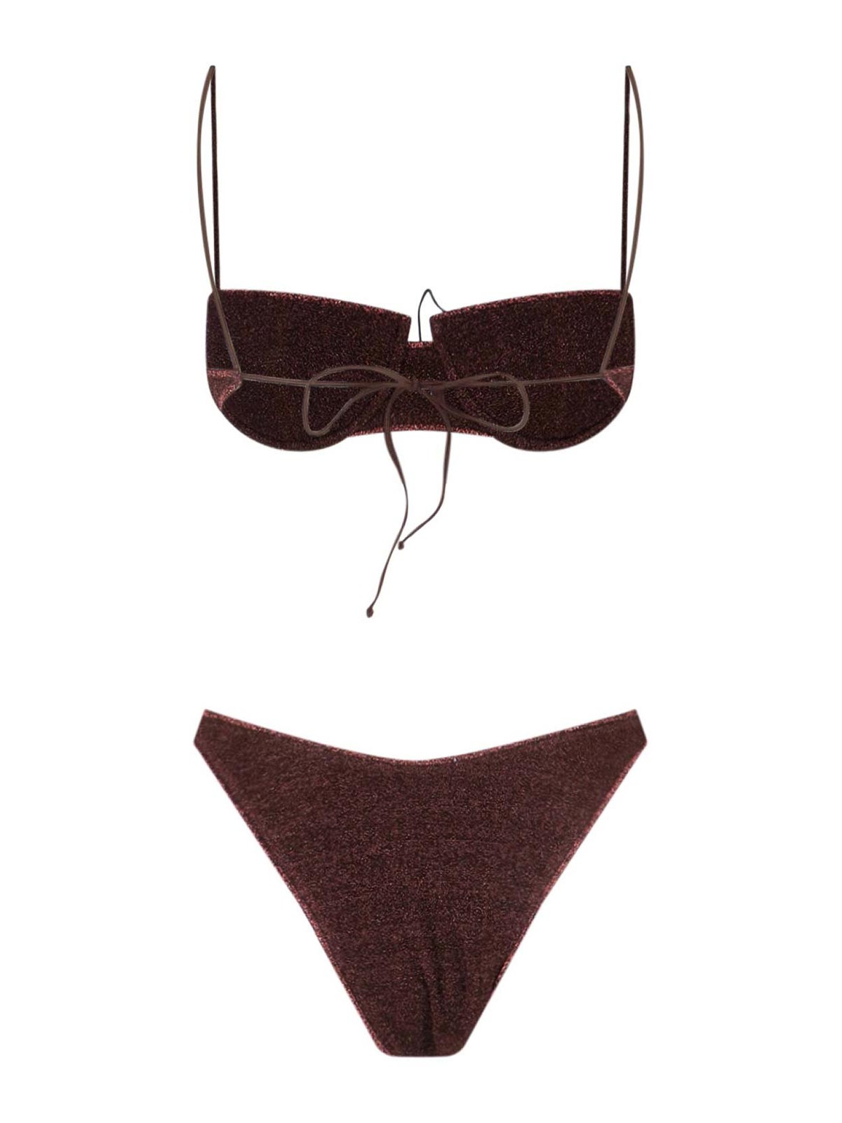 Oseree lumiere bikini in brown metallic fabric, cup design top, adjustable upper and back laces, classic briefs, side lace closure, logo pouch.