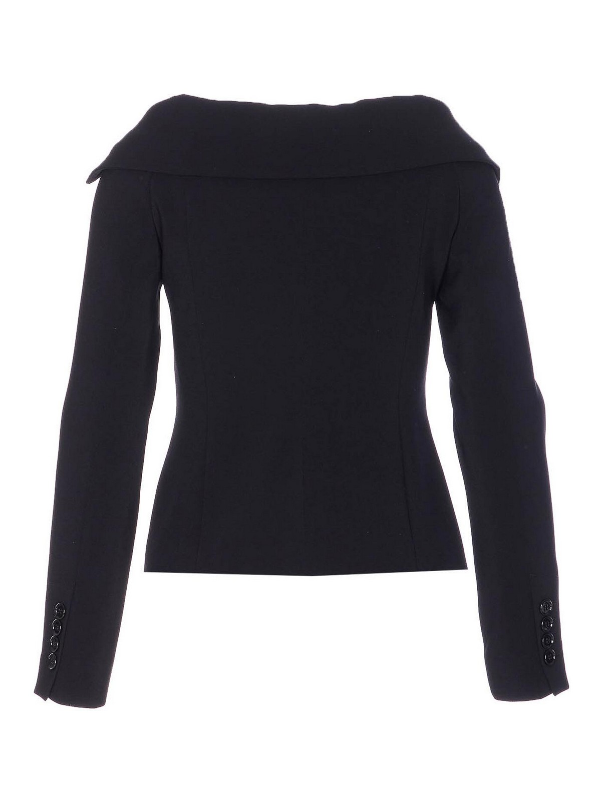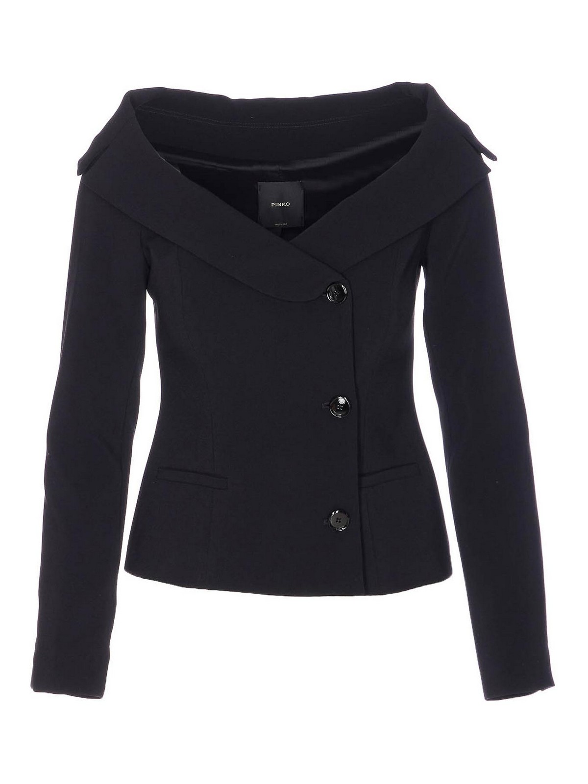 Pinko black antonina jacket with frontal double breasted buttons closure, long sleeves, buttons on cuffs, reverse detail