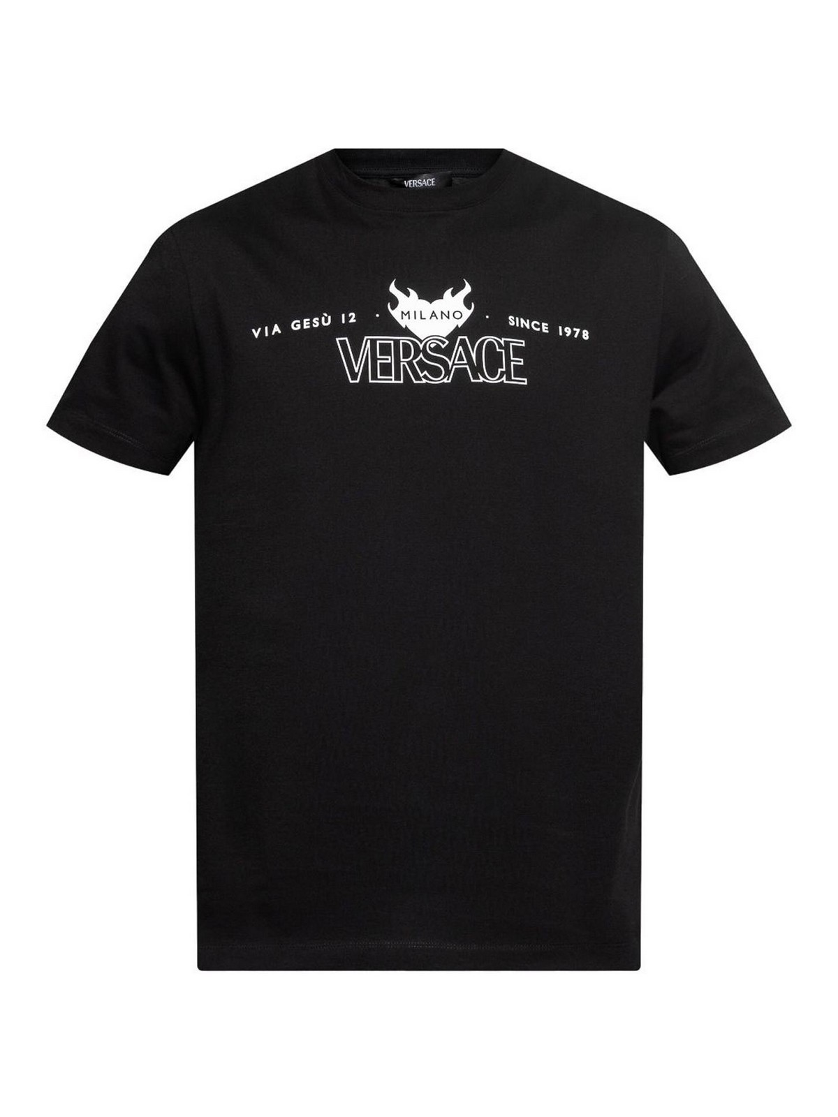 Black versace t-shirt, featuring a clean-cut design with a crew neck and short sleeves, the logo print on the front adds a distinctive and iconic touch to this versatile and contemporary piece, versace, t-shirt, black, crew neck, short sleeves, logo print on the front
