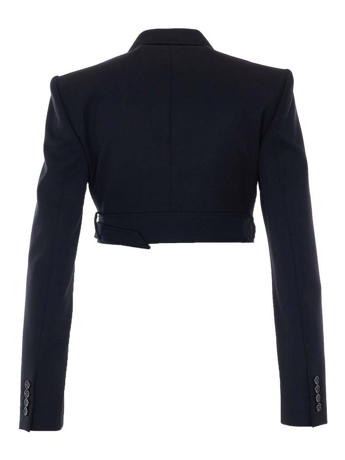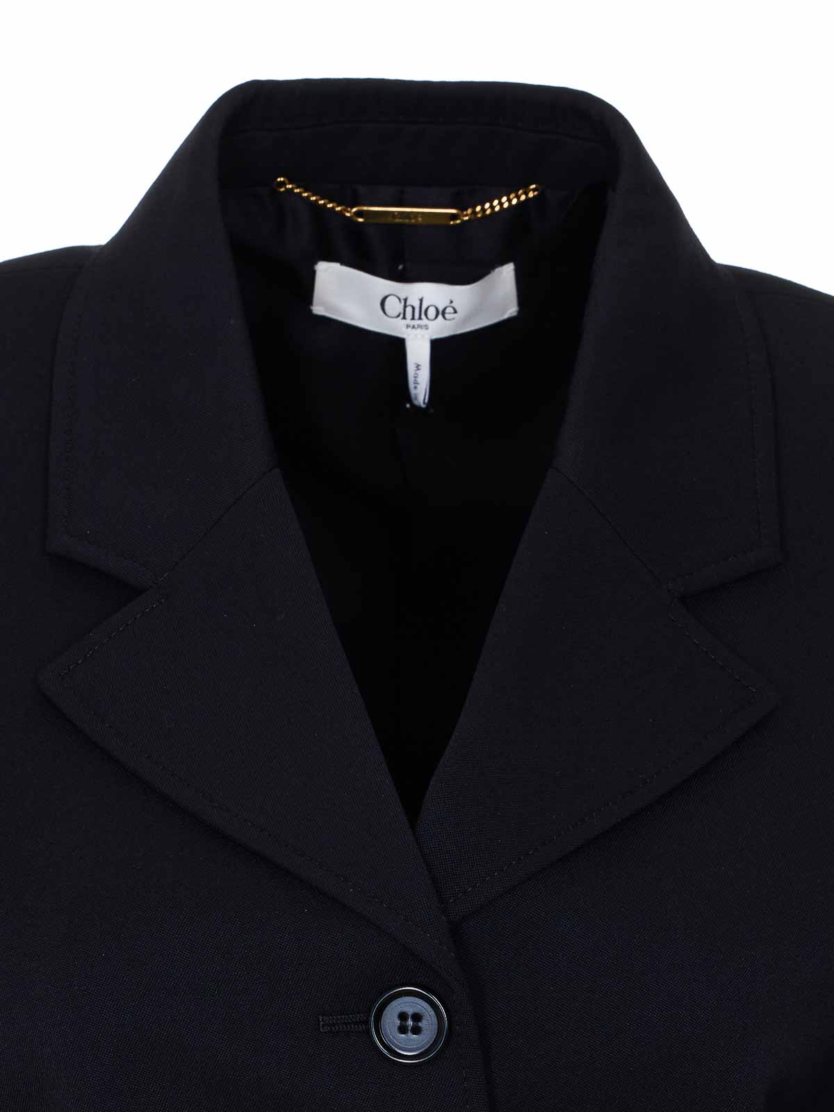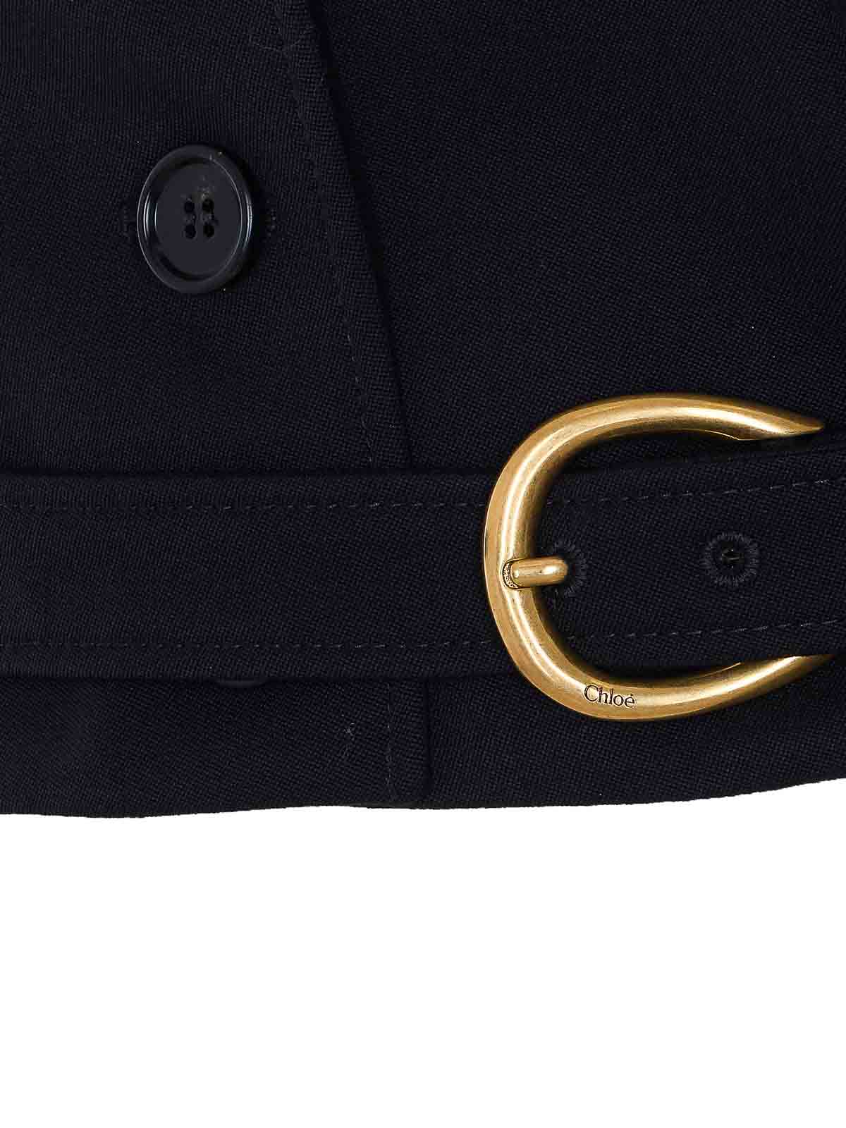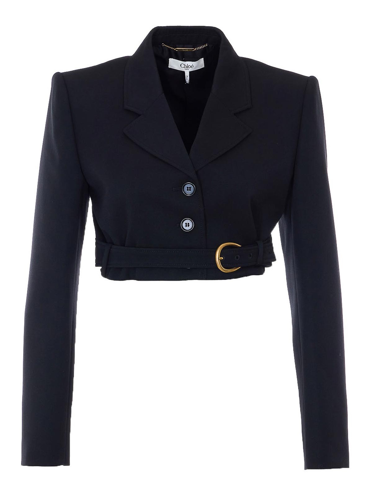 Chlo black cropped jacket, long sleeves, v-neck, buttons closure, belt at bottom, long sleeves, buttons on cuffs, reinforced shoulder