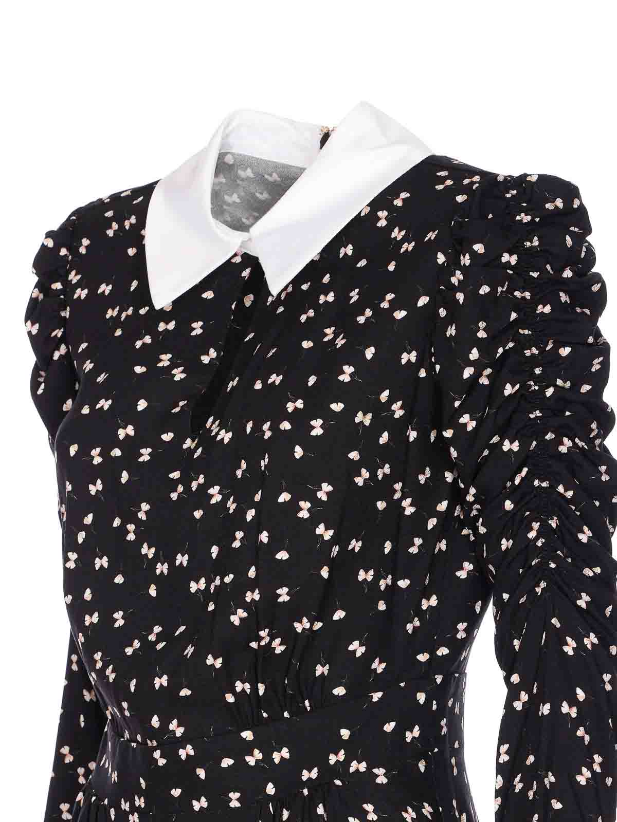 Mar de margaritas black gaia dress, zip closure, classic collar, cut out detail on front, rouches on the shoulders, full gown, patterned