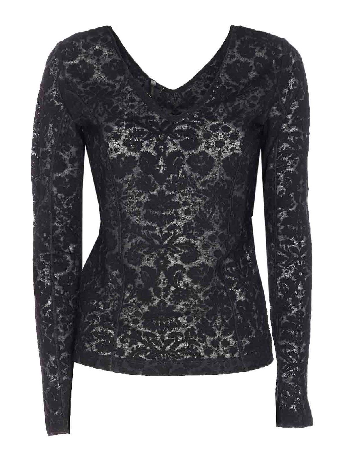 Pinko black michetti top, v-neck, long sleeves, lace effect, zip on the back