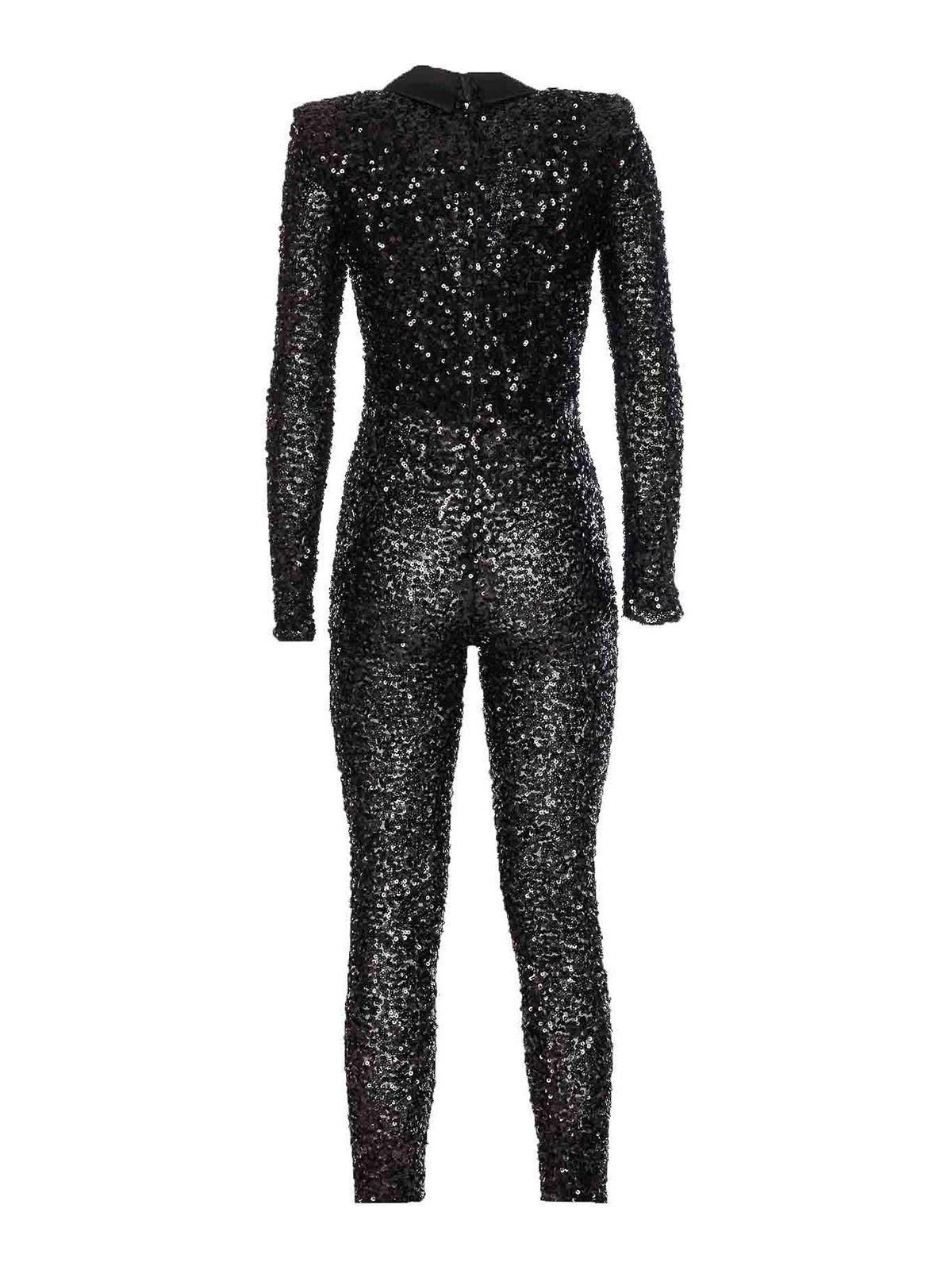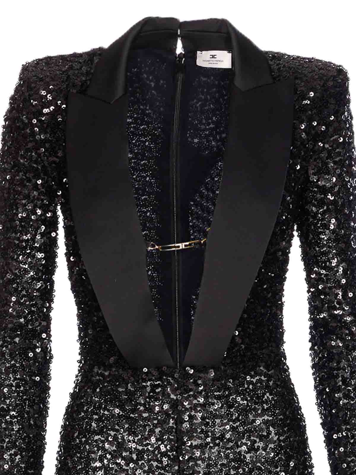 Elisabetta franchi black sequins suit with zip closure on the back, hook closure on collar, regular collar, v-neck, reverse detail, reinforced shoulder, long sleeves