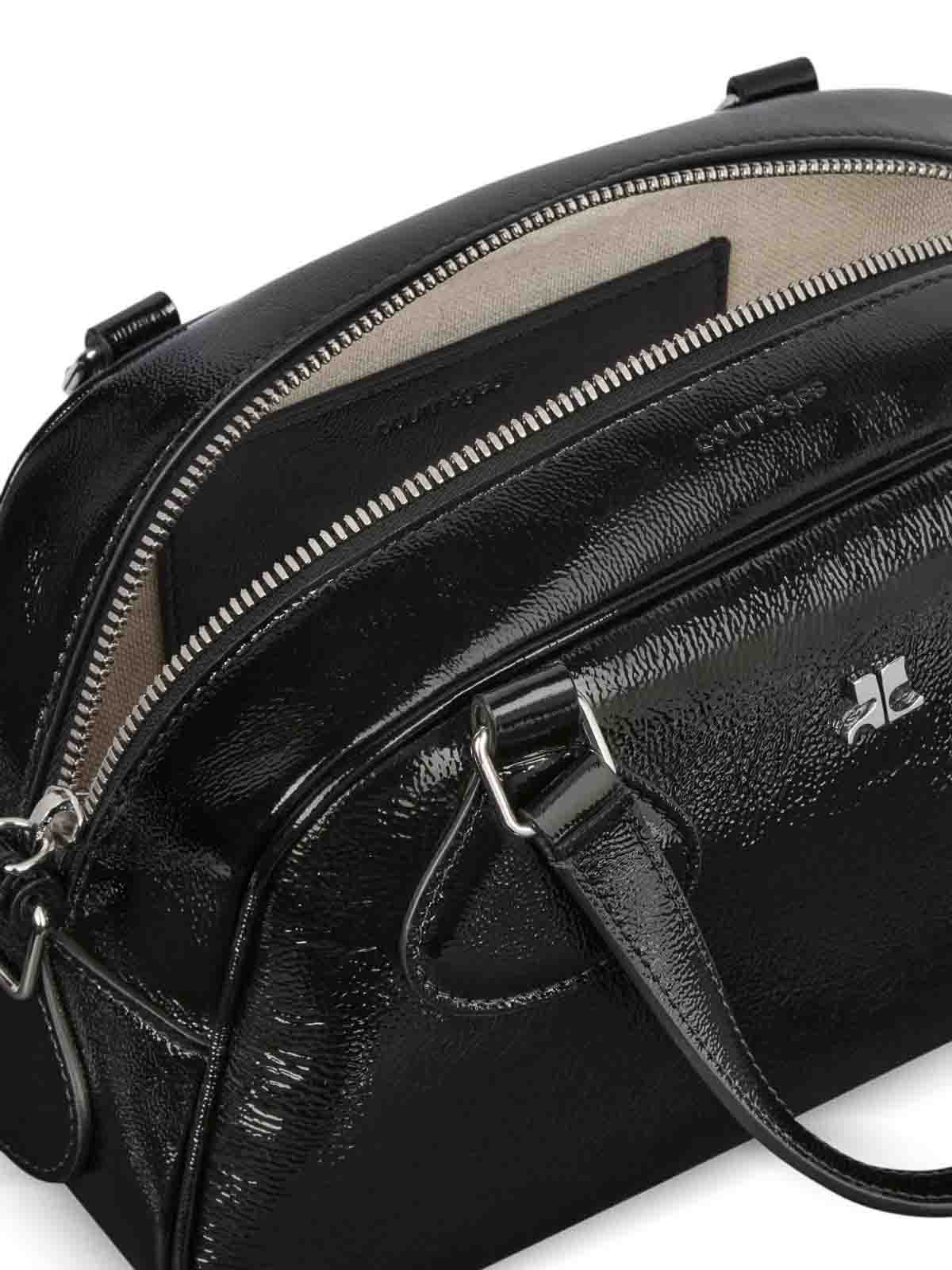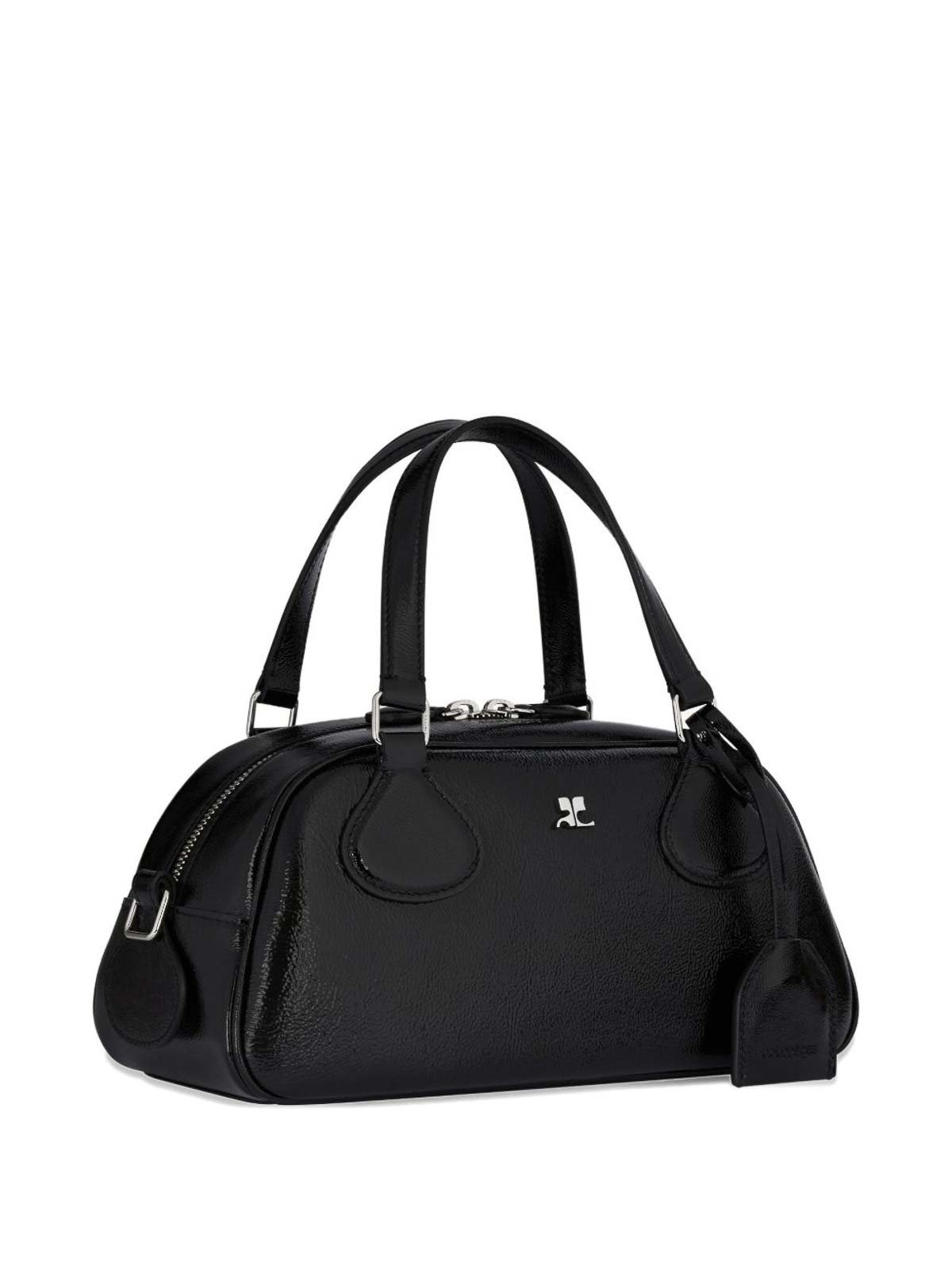 The courrges 'friday' tote bag is a sleek and functional accessory crafted in black, featuring a leather top handle, a removable shoulder strap, a logo plaque and silver-tone details that add a refined touch, perfect for completing sophisticated and urban looks, courrges, 'friday' bag with leather top handle, black, leather handles, removable shoulder strap, logo plaque, silver-tone details