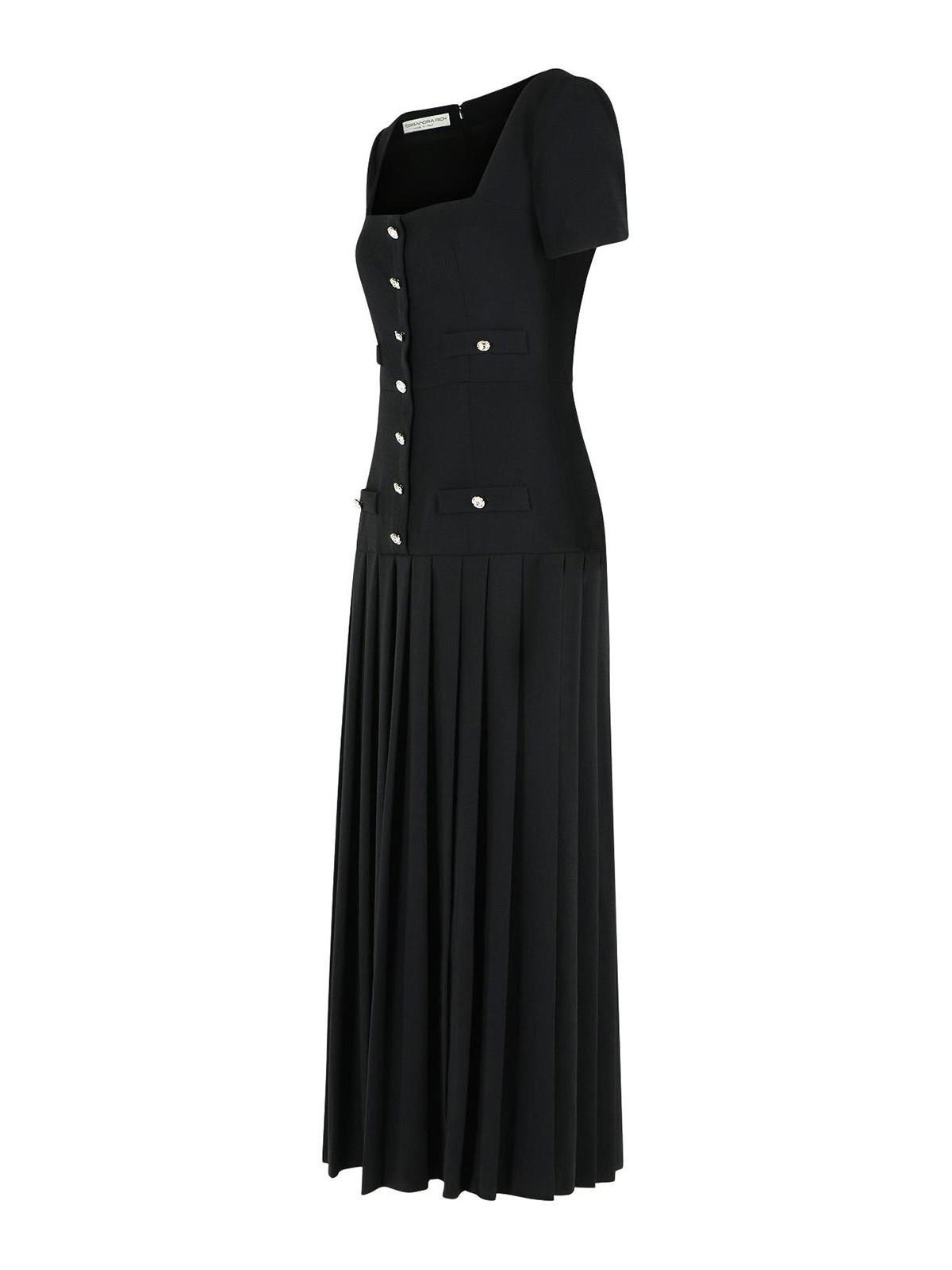 Square neckline, effect decorative buttons on the decorative pockets back with invisible zip and hook pleated skirt with side split bodice and lined sleeves
