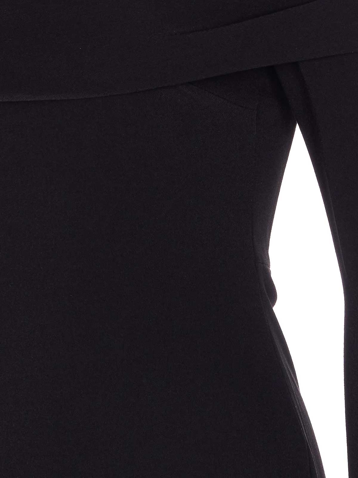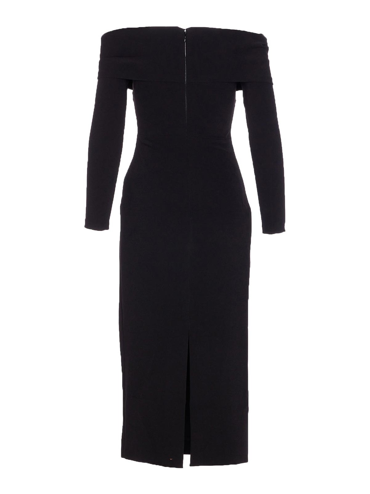 Solace london black yuni midi dress, zip and button closure on the back, boat neckline, 3/4 sleeves, split on the back