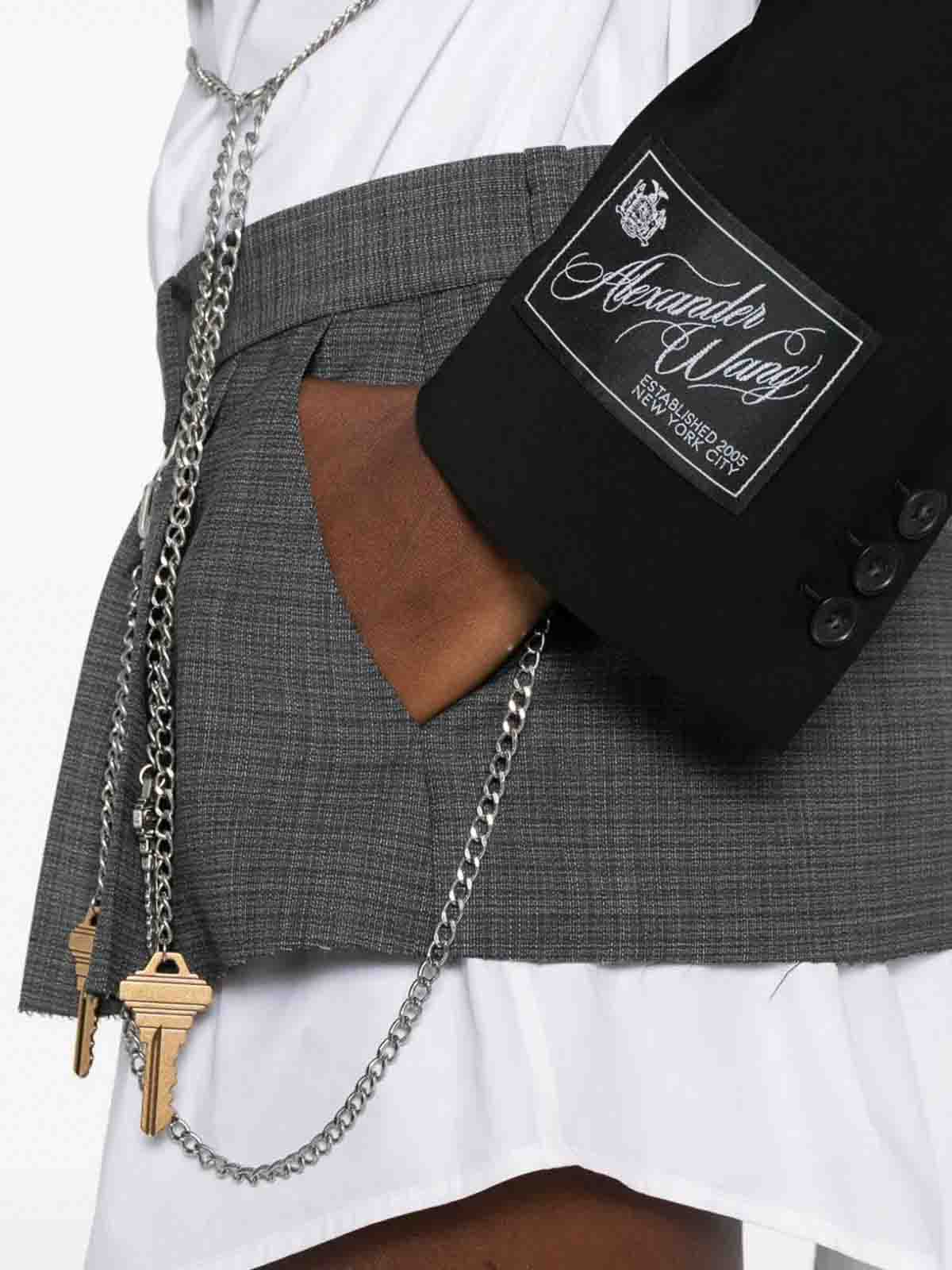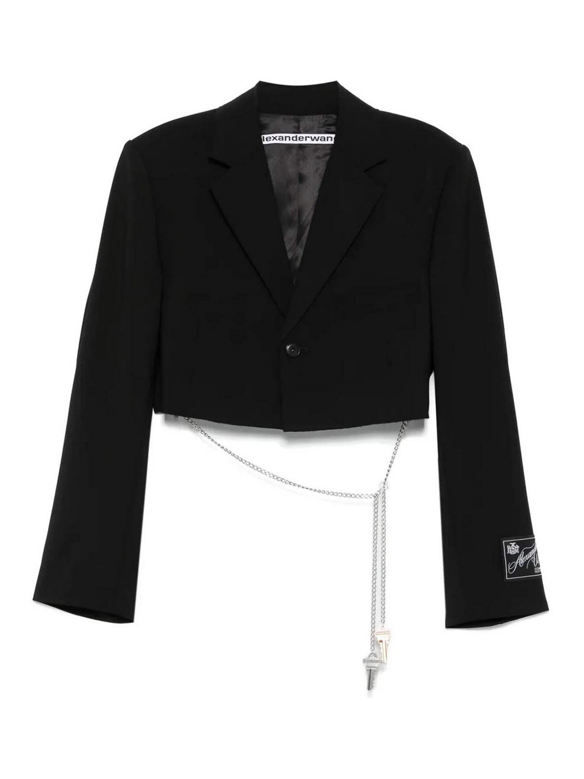 Single-breasted, single-button front closure, logo patch on the sleeve, long sleeves, cropped design, adjustable and removable logo key chain. composition 86% wool, 9% polyamide, 5% elastane