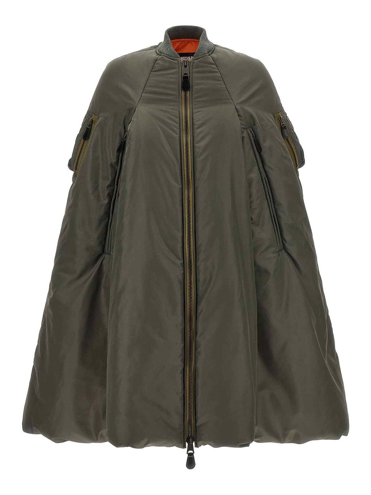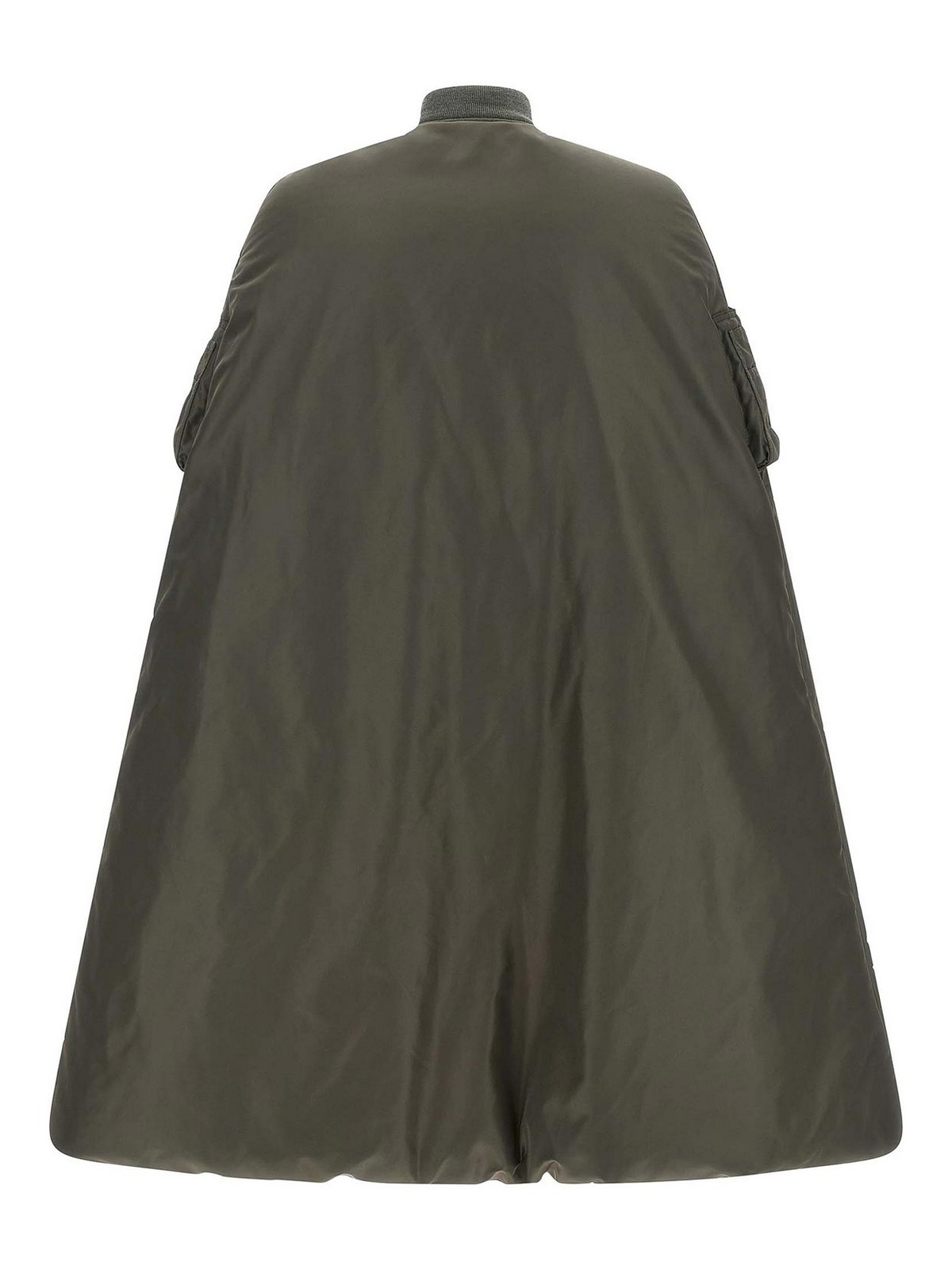 Long padded nylon cape with stretch wool knit details, bomber jacket-inspired pattern, contrast lining, front zip closure, side zip to let your arms pass.