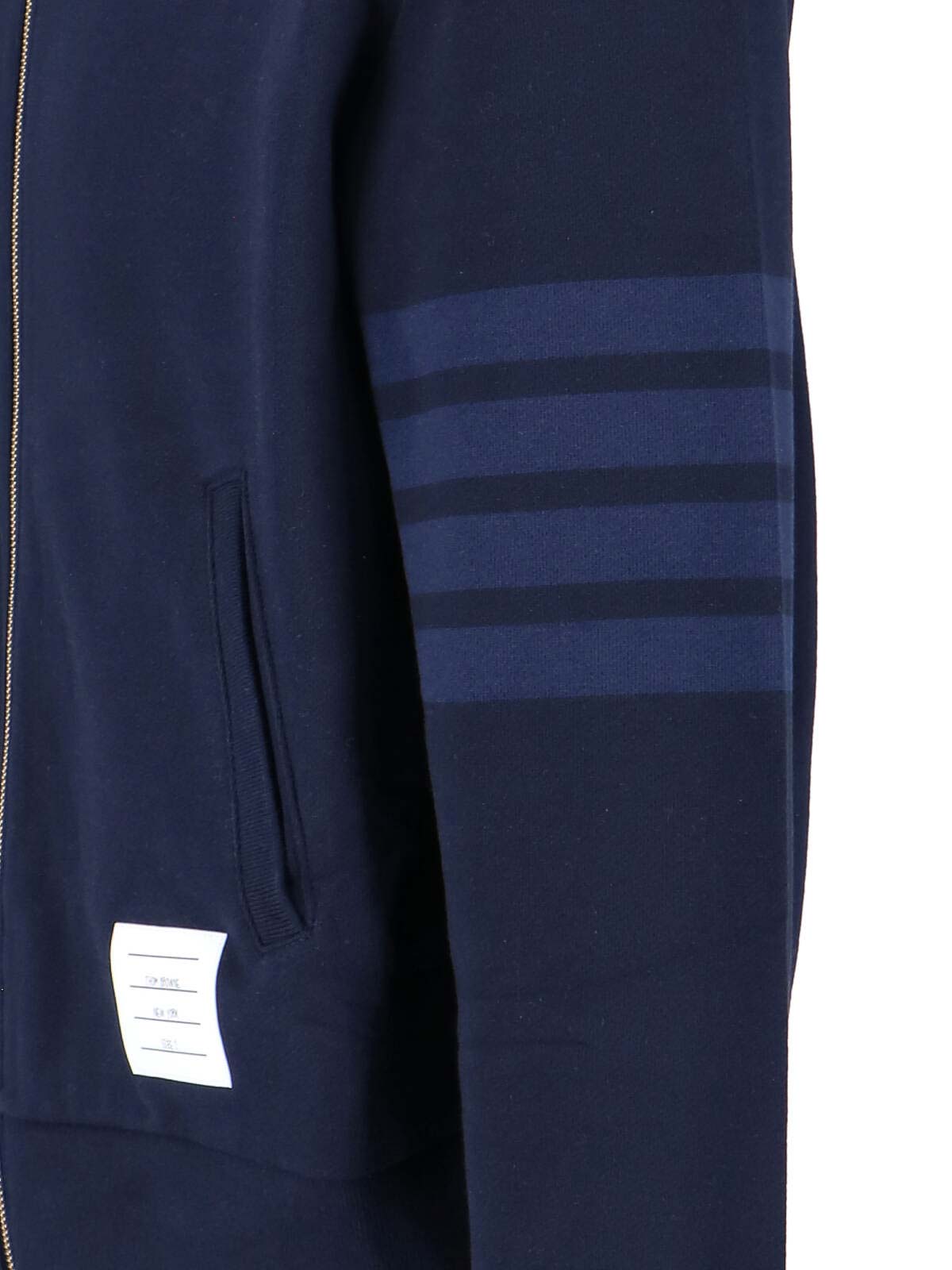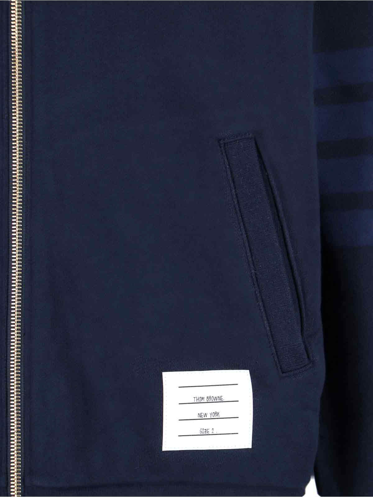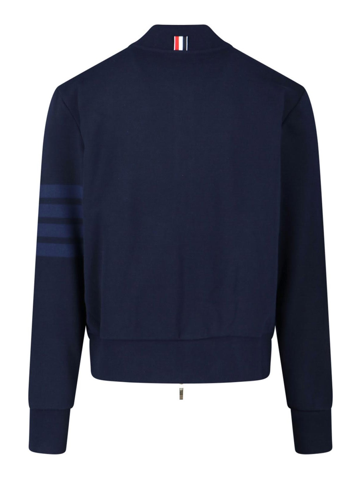4-bar bomber Thom Browne, in blue cotton, navy tonalit, ribbed neck, double zip closure, two side pockets, print iconic tone strips on sleeve tone, grosgrain tricolor tongue back, bottom and ribbed cuffs, straight hem.