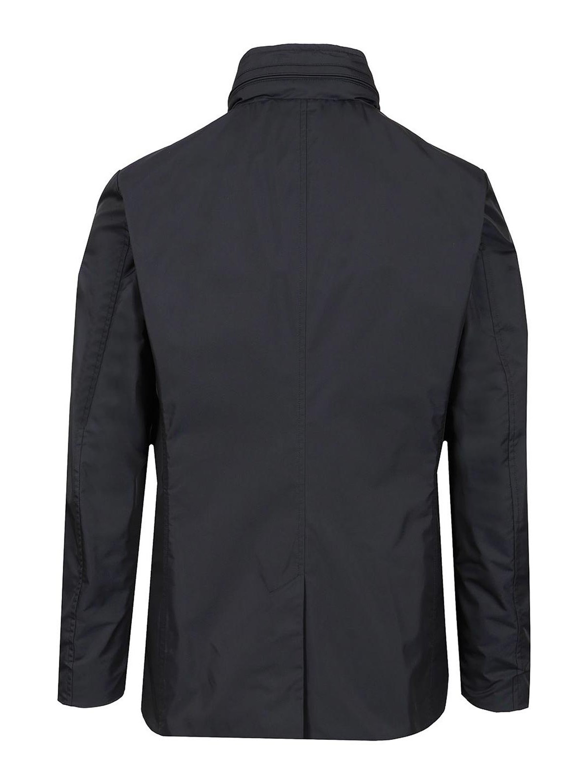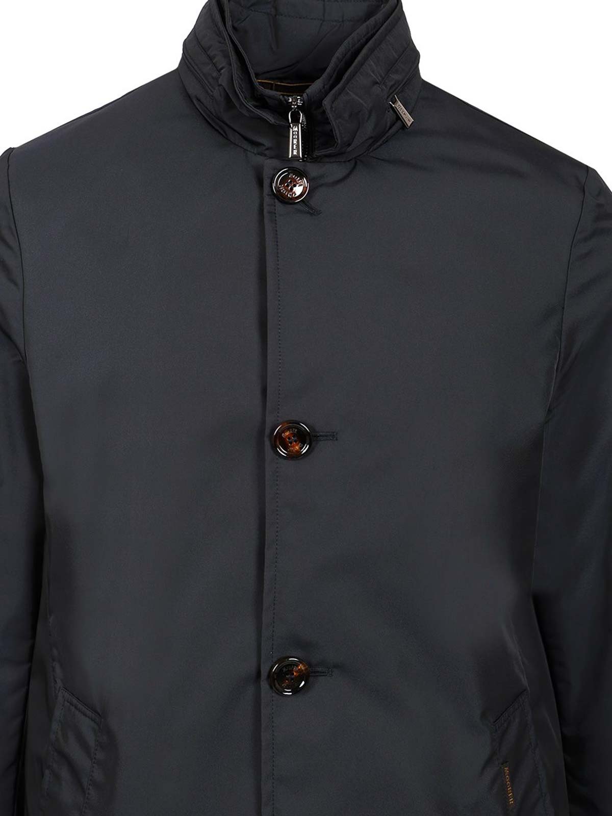 Memory technical with a light finish removable hood hidden in the collar double with a two, way zip and buttonhole with buttons side welt pockets center back vent