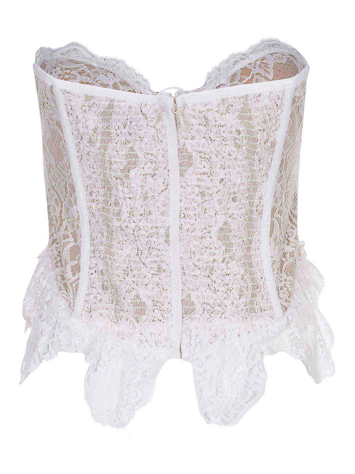 Bustier by giuseppe di morabito made of white polyamide. heart-shaped neckline. sleeveless. entirely in lace. contrast bottom in camel. front closure with crossover ties. closure with hooks at the back. internal structure. 100% polyamide made in italy
