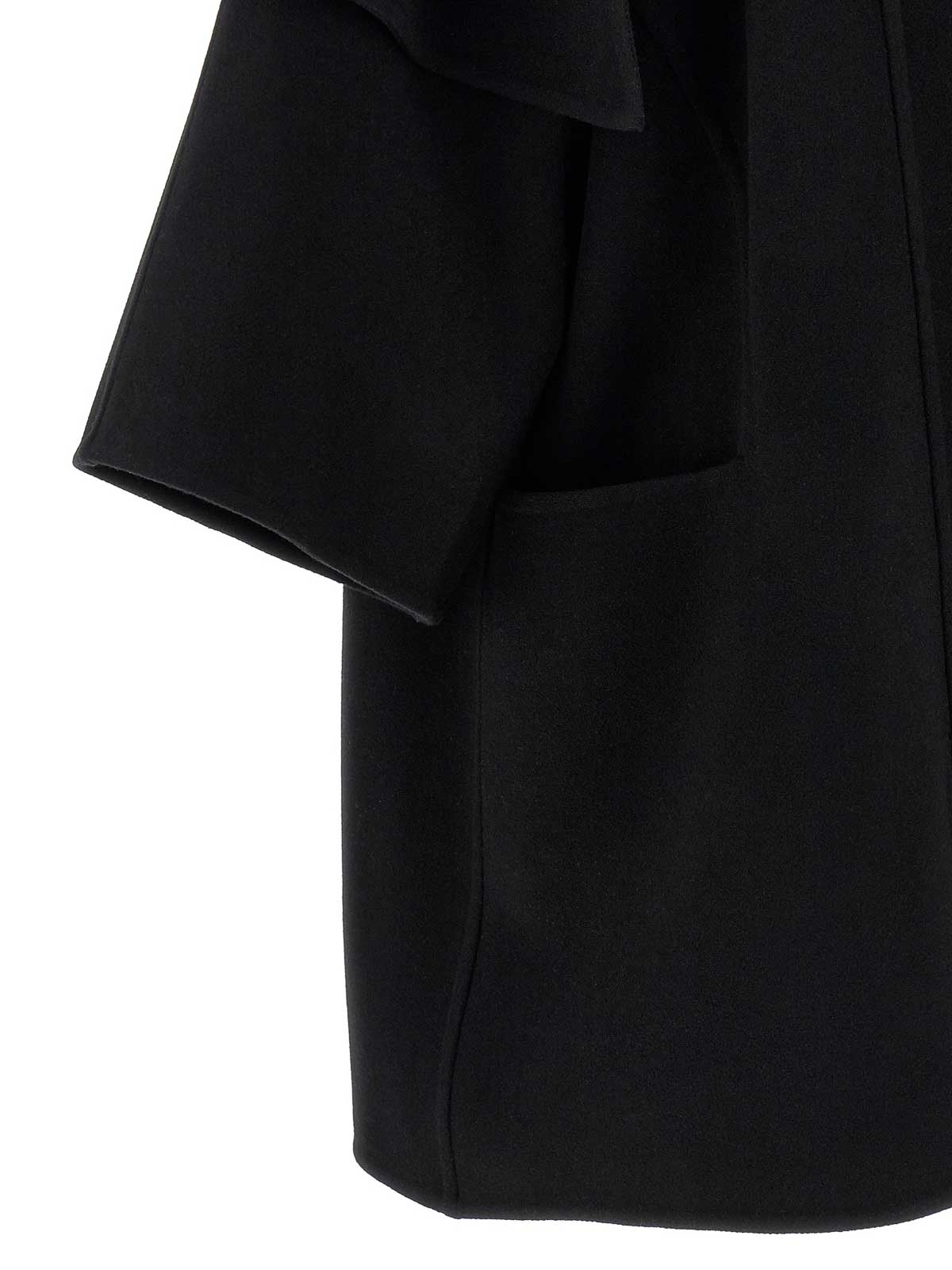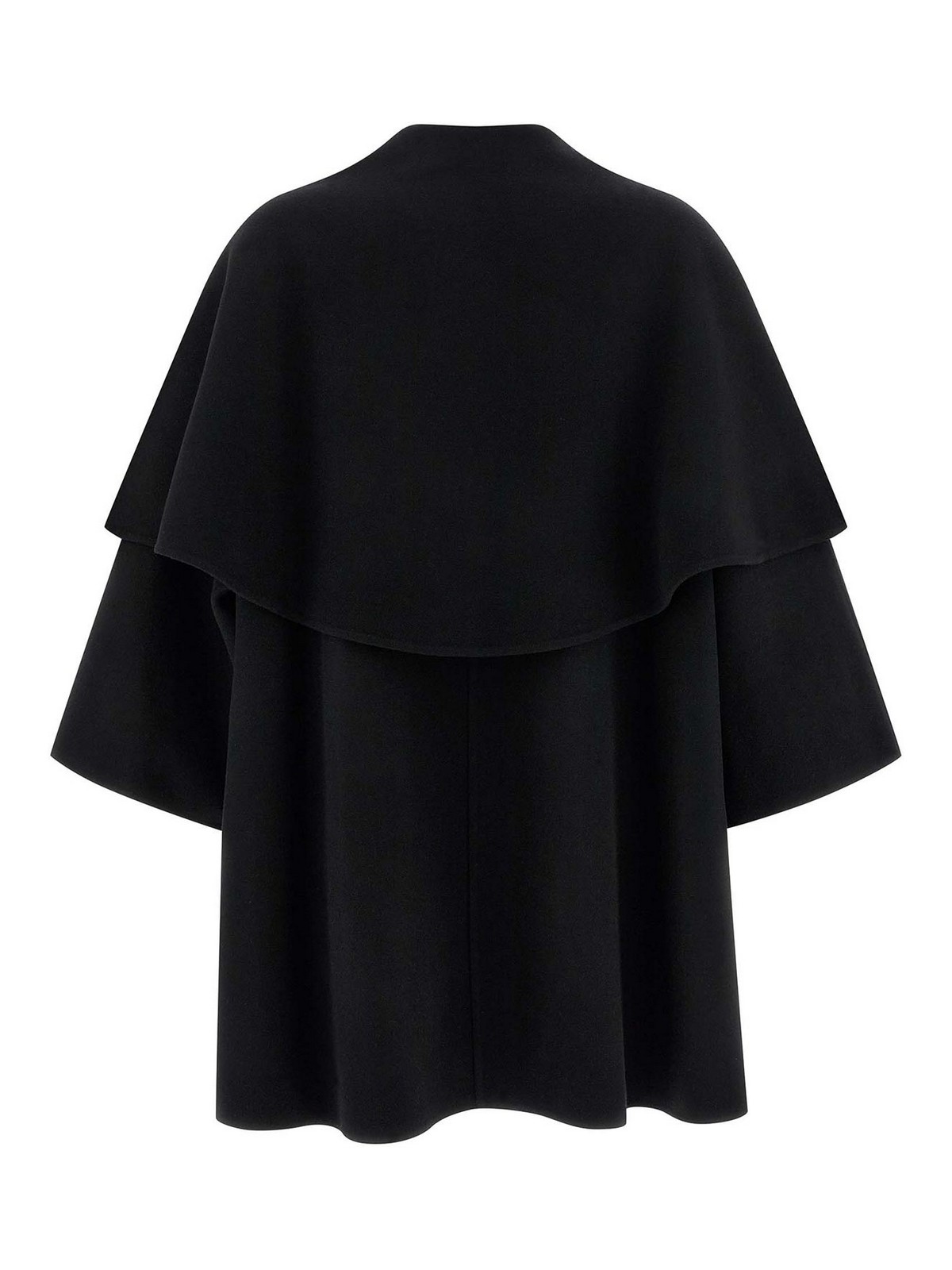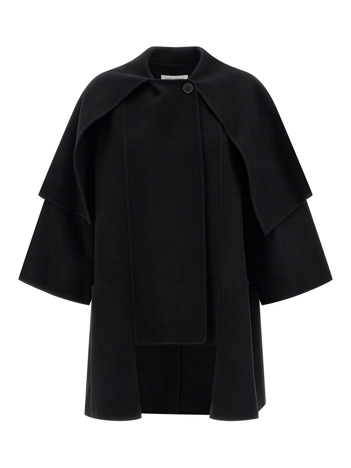 Virgin wool coat with cape on the shoulders, asymmetric one-button front closure, 3/4 sleeves with dropped shoulder, pockets, asymmetrical hem, unlined.