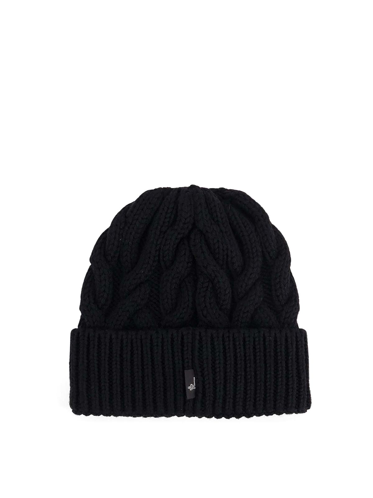 With cable fold, logo patch on the front, made in Italy, 100% virgin wool