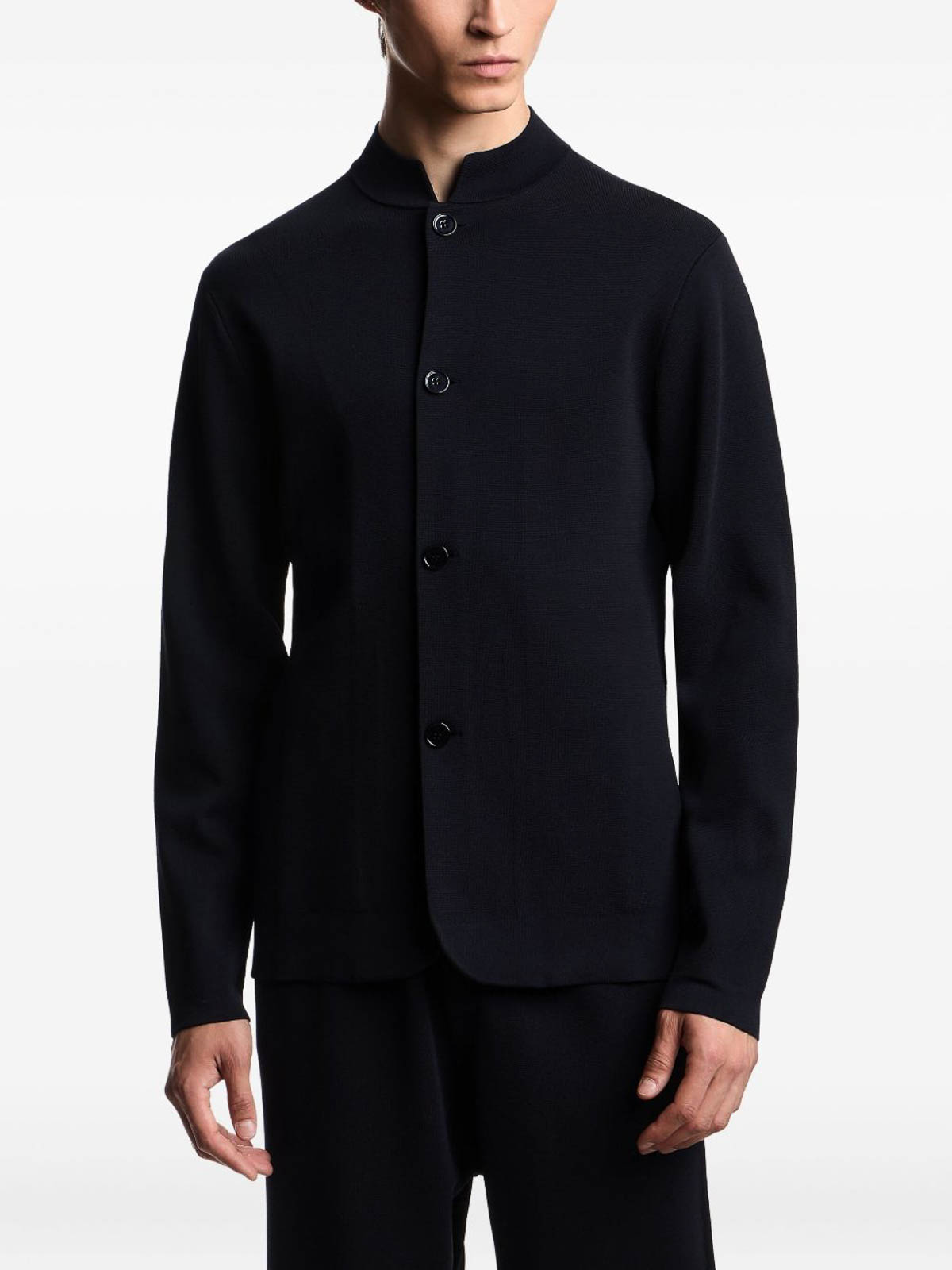 Dark blue mandarin collar button fastening long sleeves knitted texture straight hem