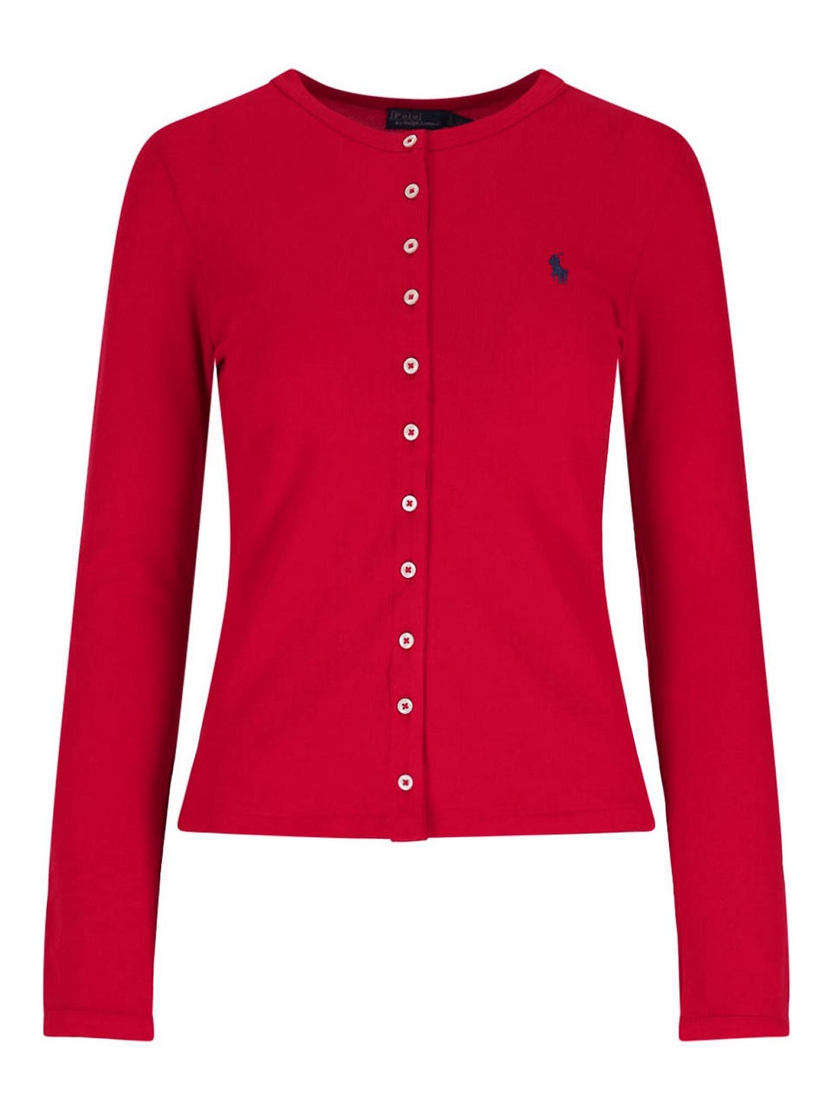 Cardigan Logo Polo Ralph Lauren, in red cotton, round neckline, buttons closure, Blue logo embroidery chest, cuff buttons, straight edge.