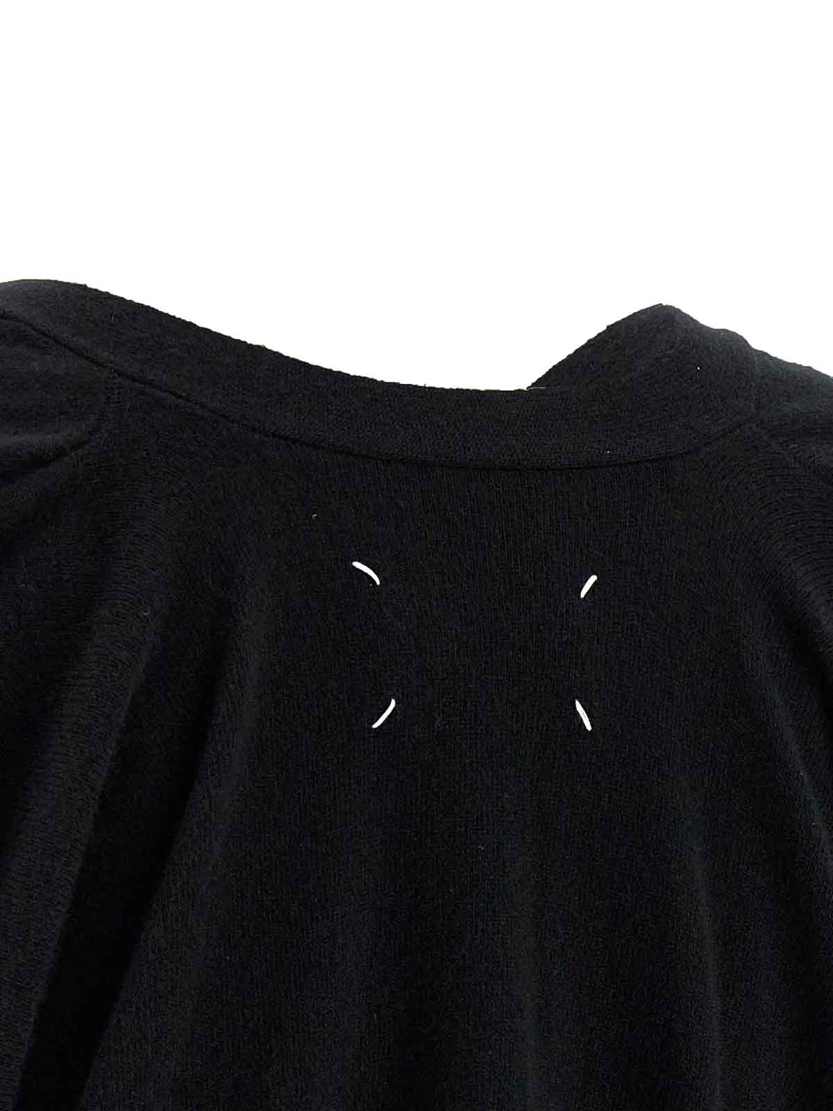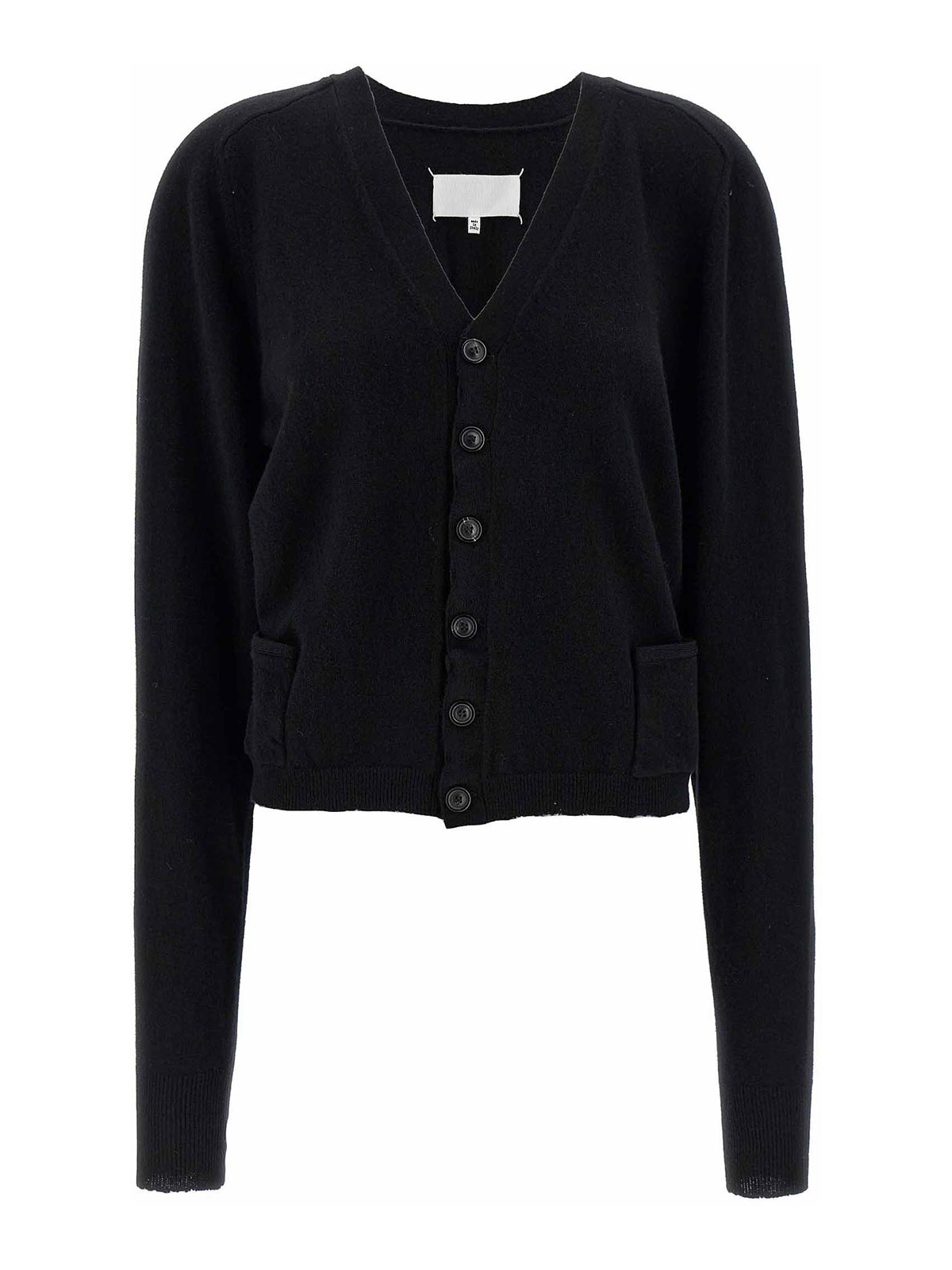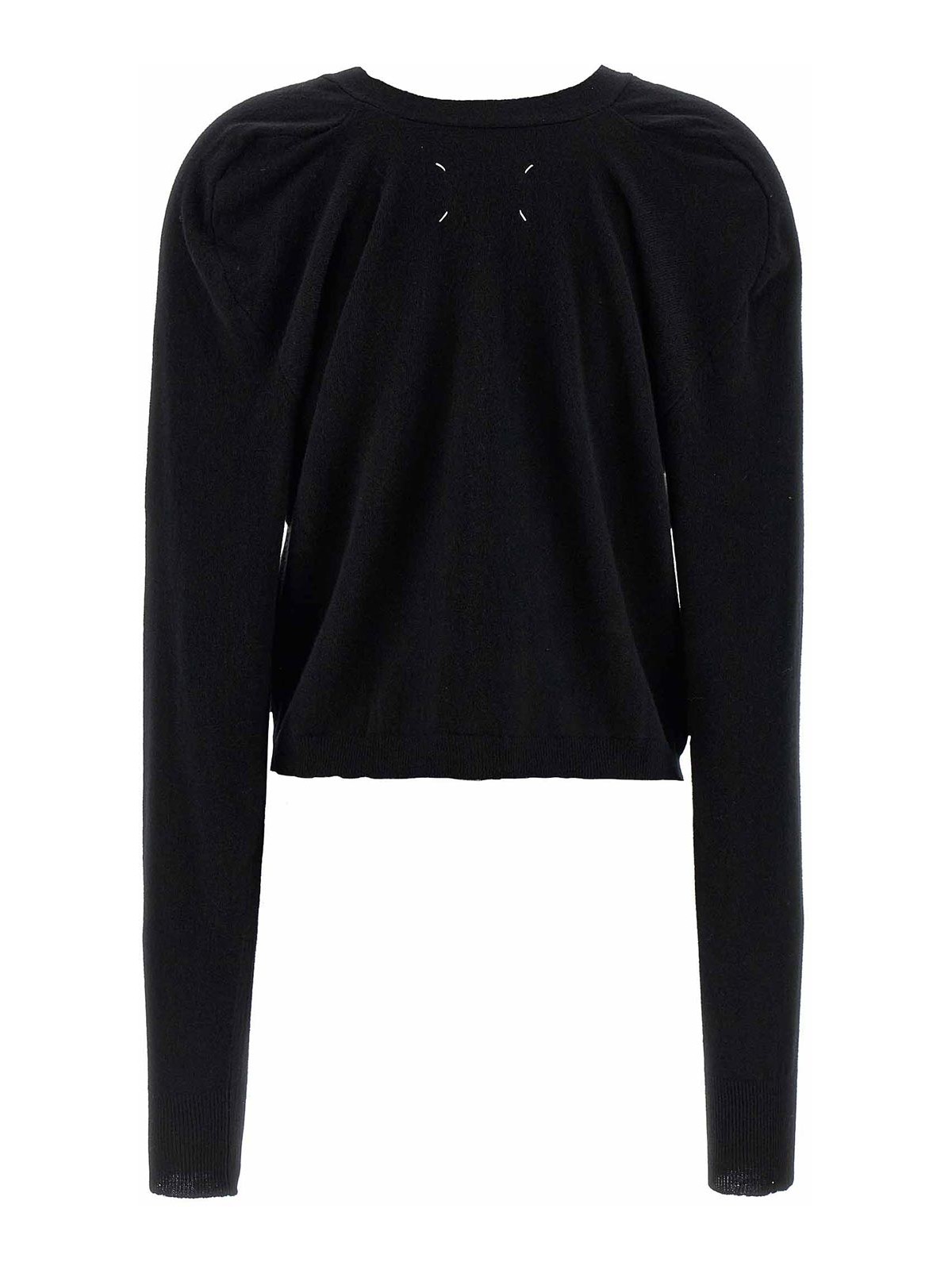 Wool cardigan, slightly cropped model, v-neck, front button closure, pockets, long sleeves with ruffles on the shoulders, 'four stitches' at the back.