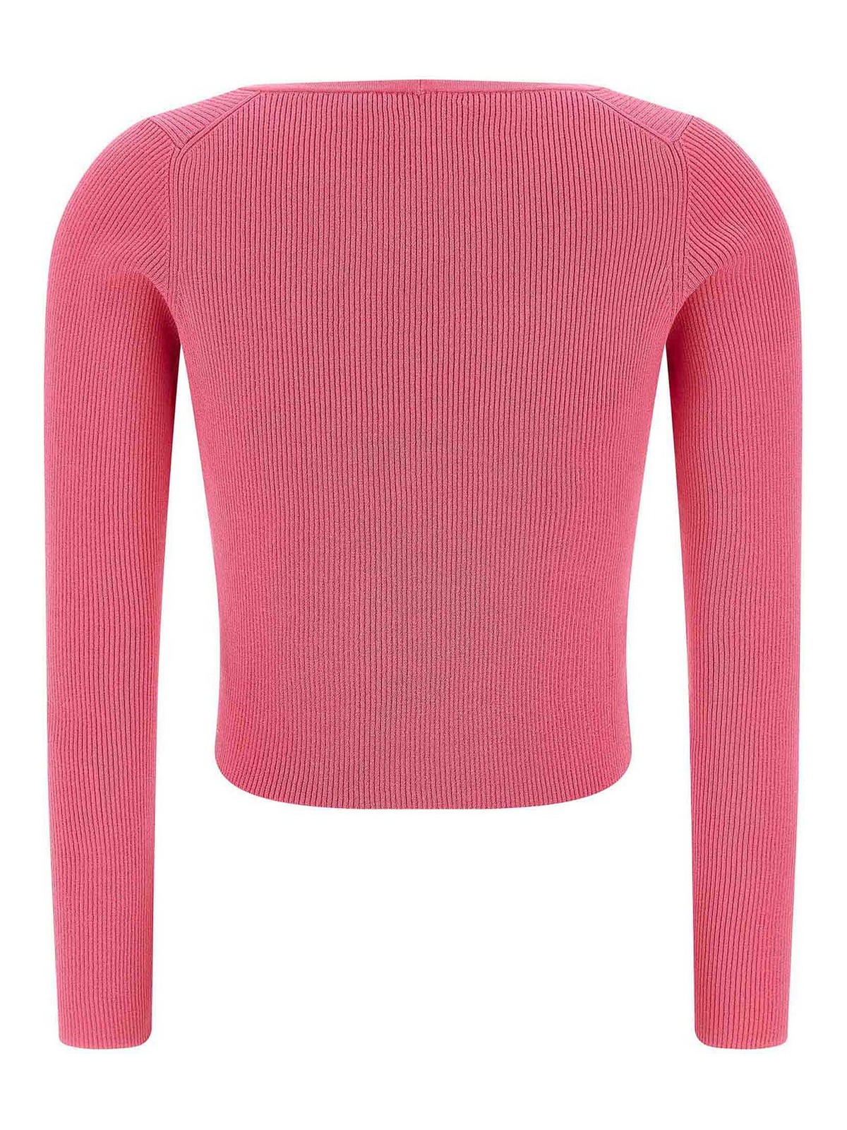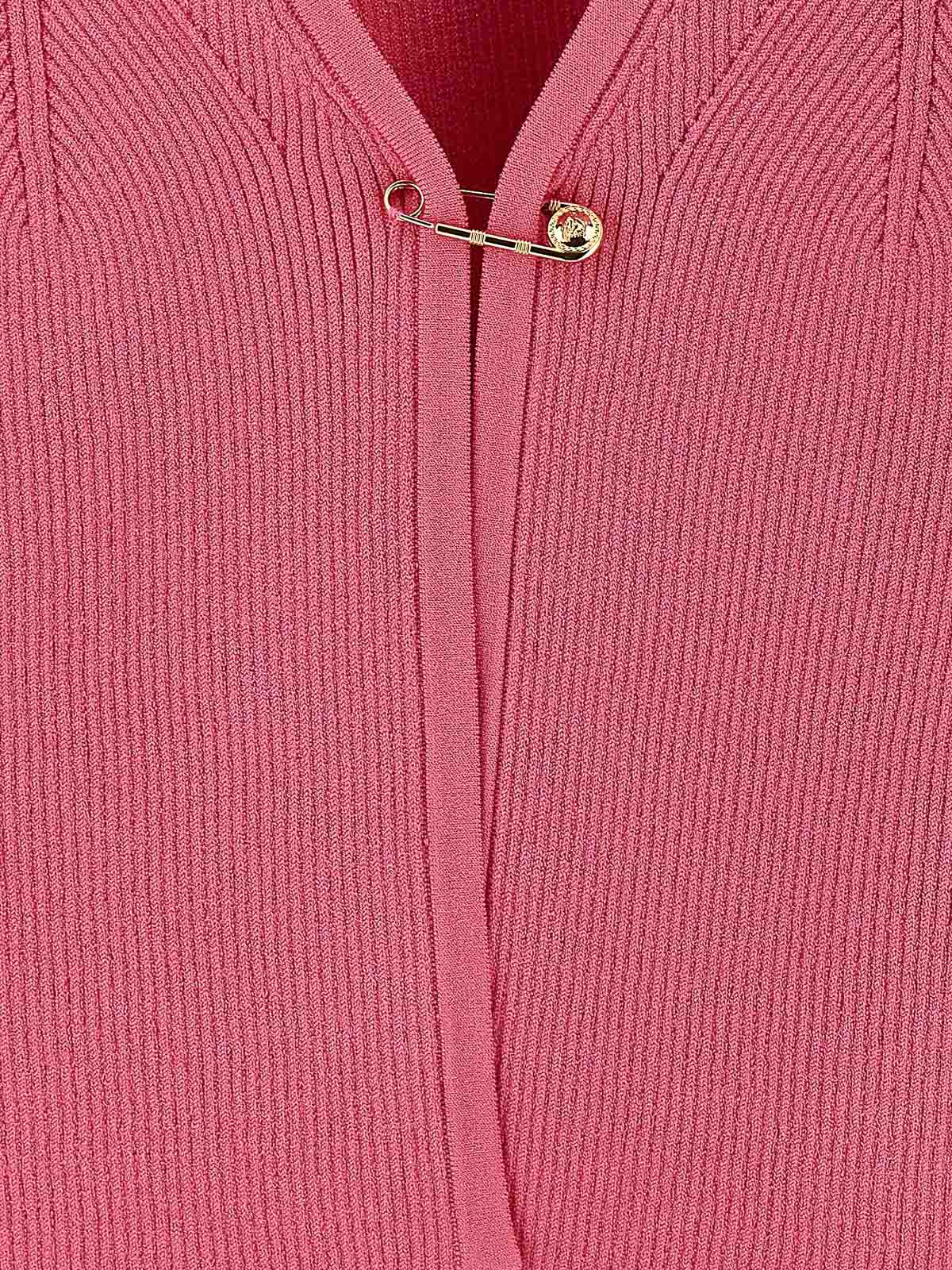 Stretch ribbed knit cardigan, crop style dressing gown style with removable metal 'safety pin' on the front, long sleeves, v-neck.