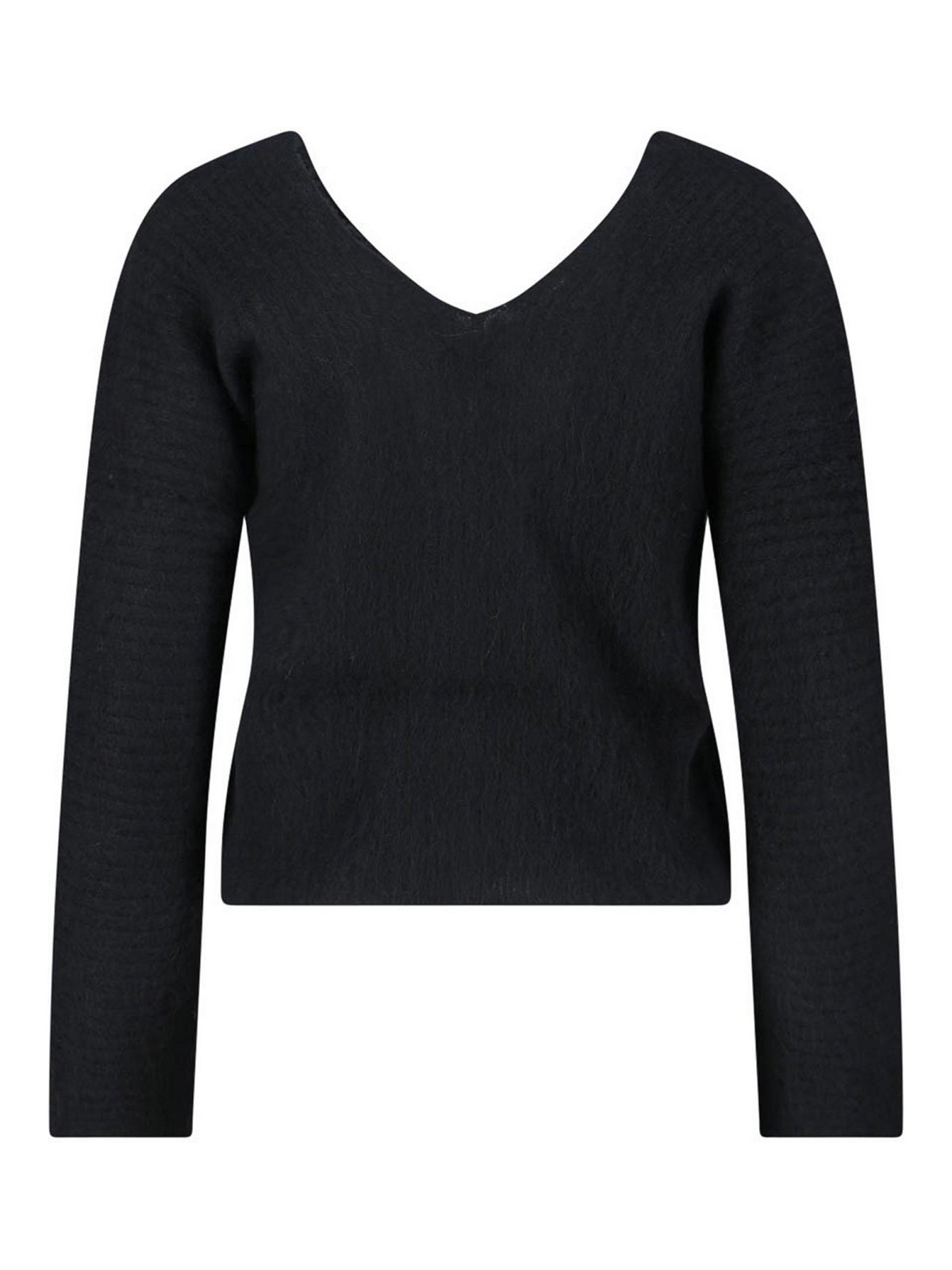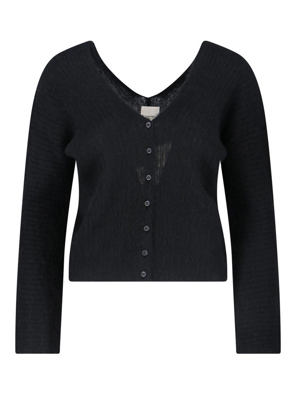 Calvin klein wool blend cardigan, ribbed workmanship, black deep v-neck, maxi back neckline, button closure, straight hem.