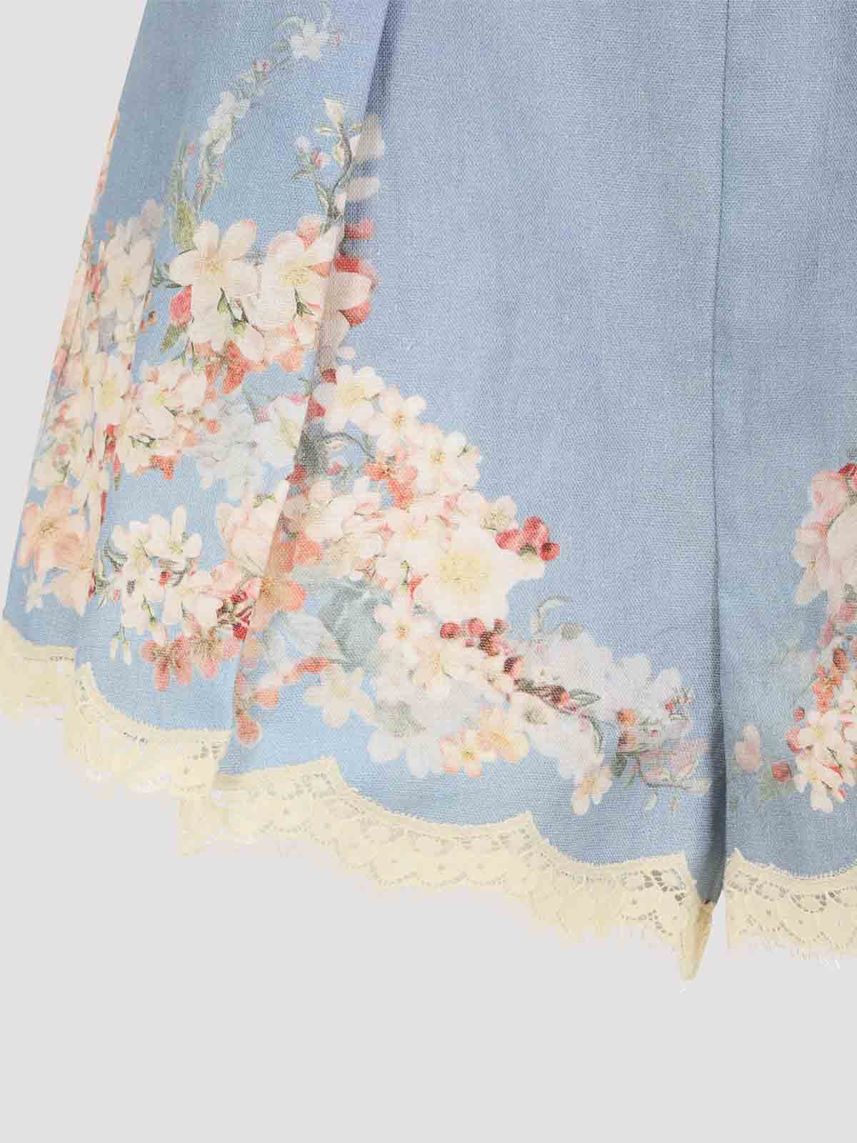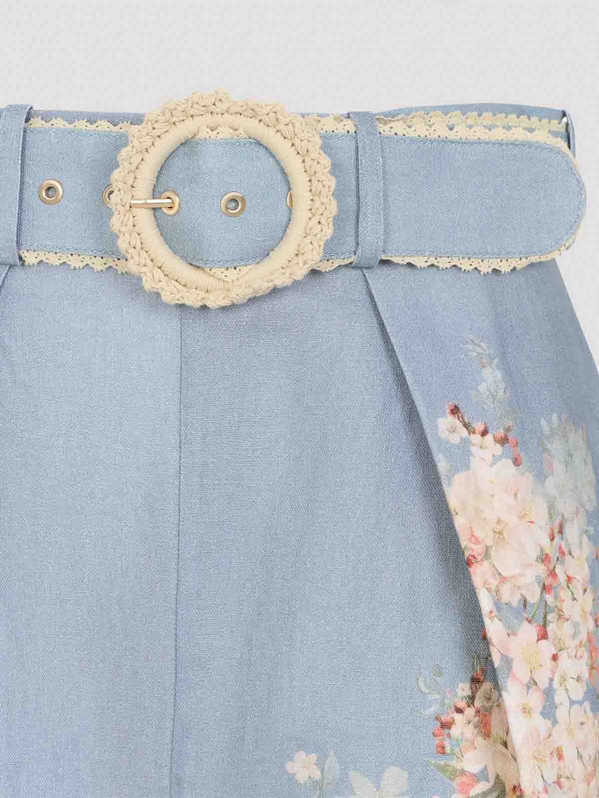 Zimmermann cascadian tuck light blue ramie shorts. light blue ramie, seasonal teal blue botanical floral print, high waist, tonal removable belt with crochet buckle, front darts embellishment, concealed zip fastening at the center back, lace trim at the belt and at the hem.