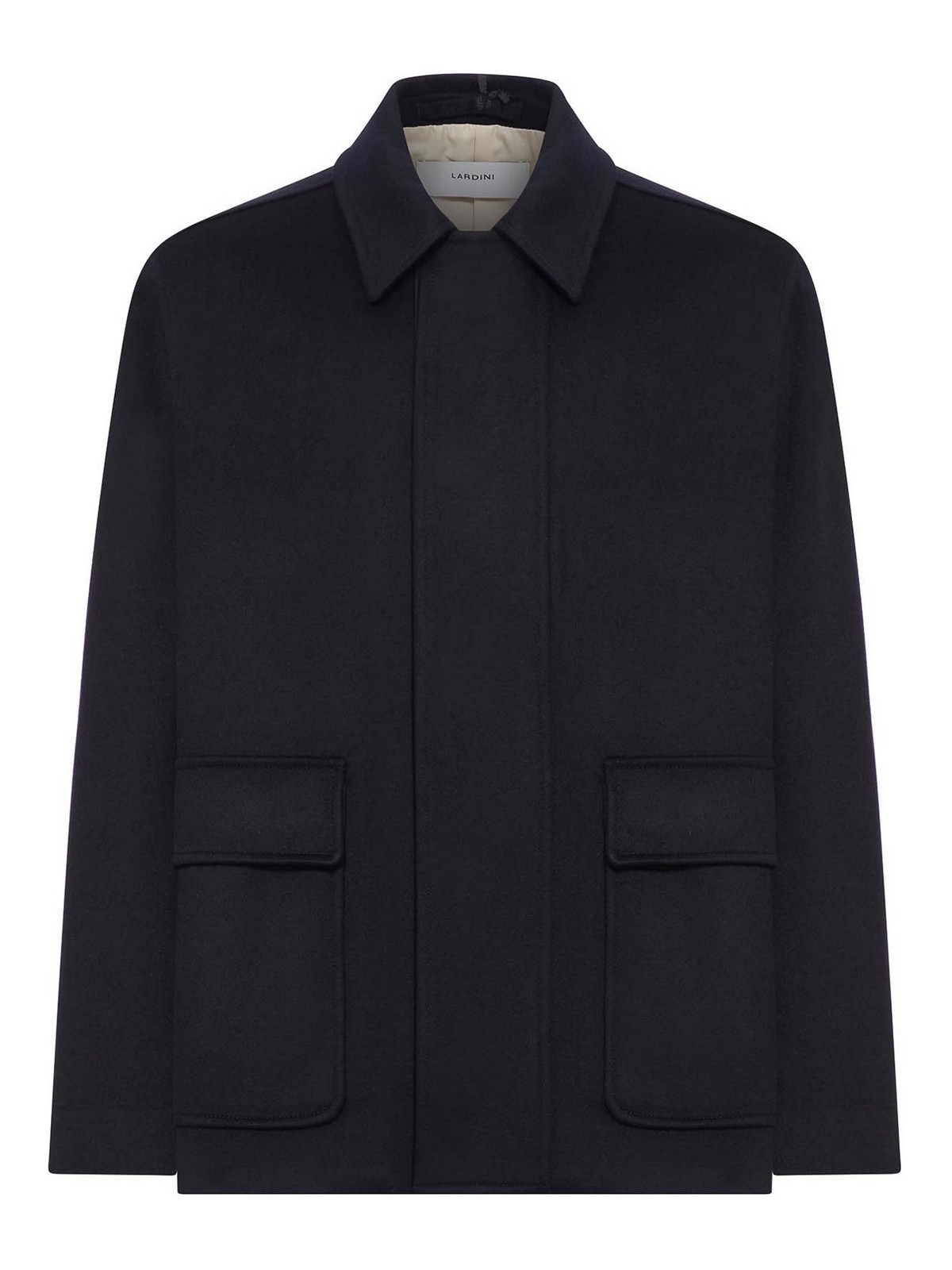Classic collar, zip and hidden button, long sleeves with buttoned cuffs, two flap pockets, straight hem, lined, -, color blue