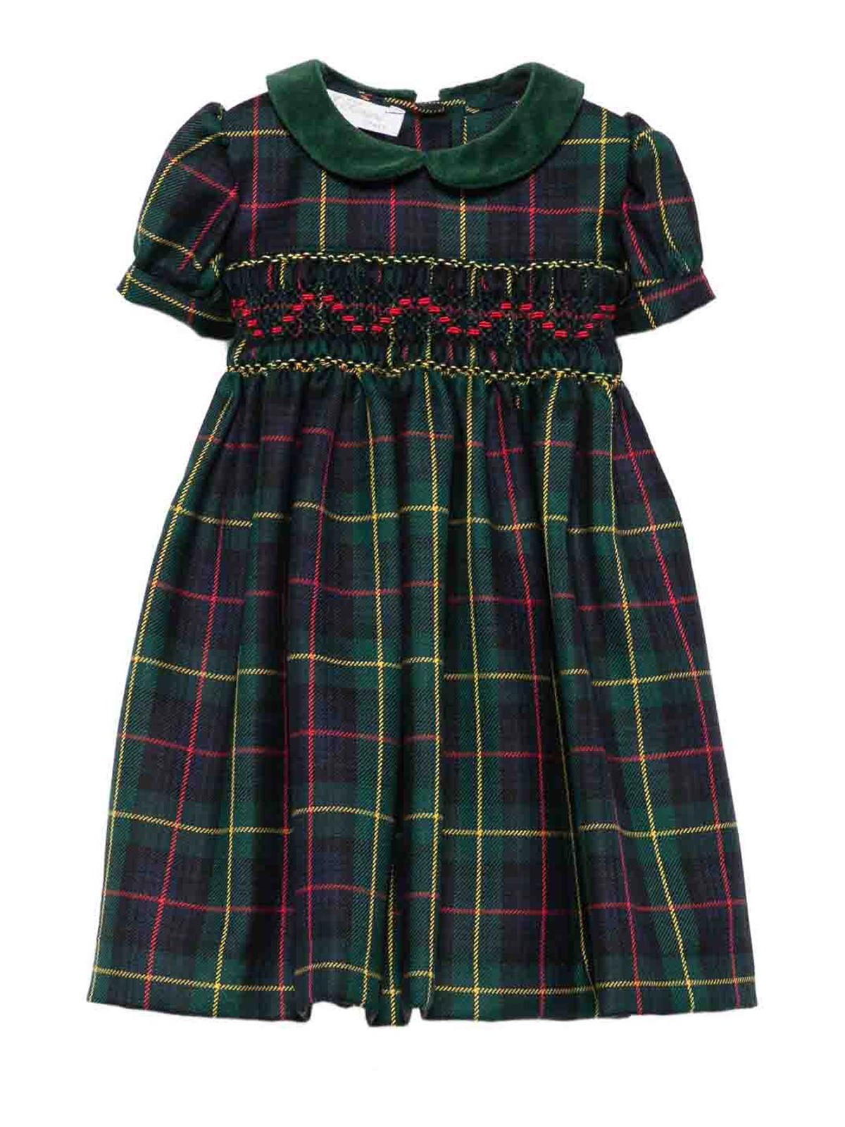 Checked dress features dark green honeycomb tartan pattern peter pan collar short balloon sleeves with buttons on the back