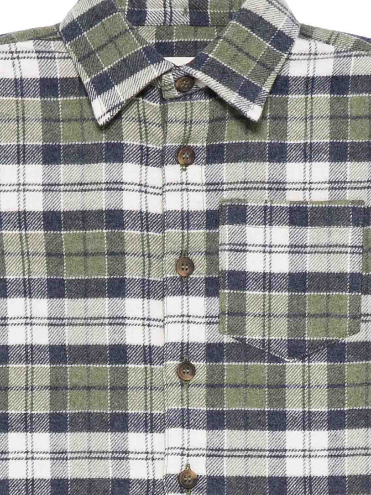 Checked shirt features blue / army green checked pattern buttoned chest pocket long sleeves buttoned hems