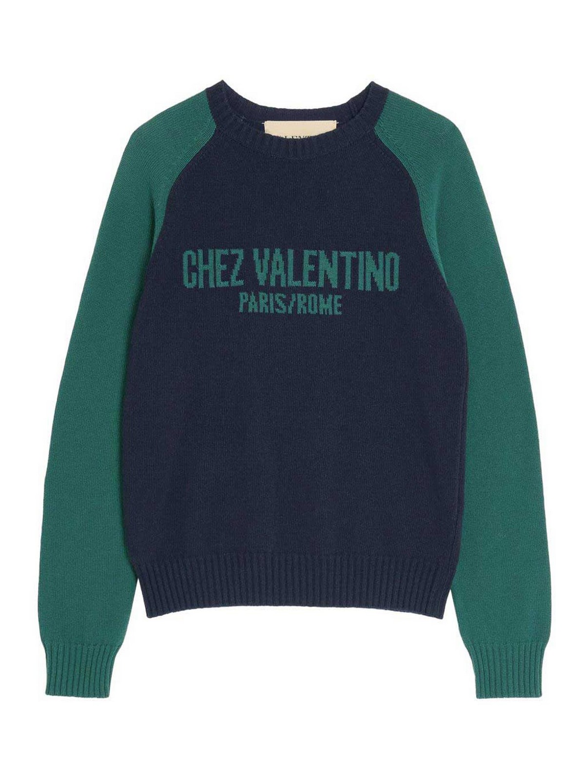 Navy blue intarsia-knit logo ribbed trim long raglan sleeves straight hem