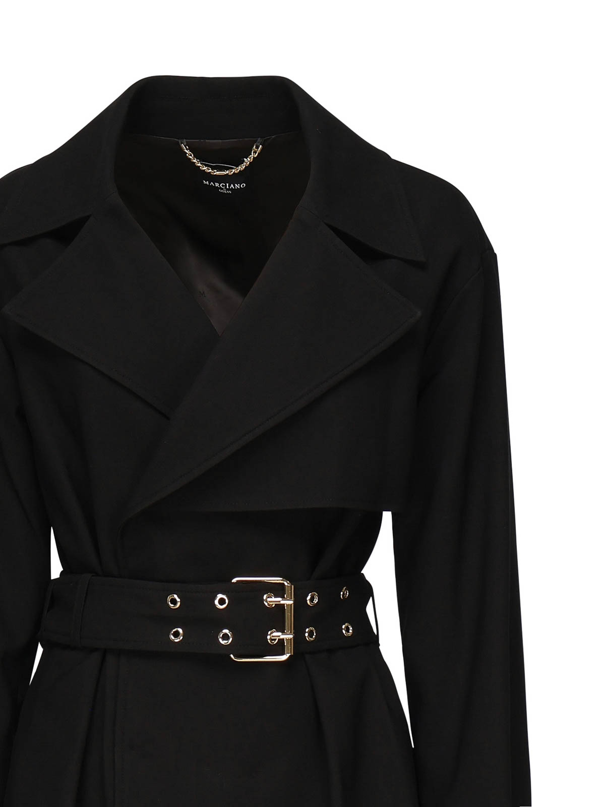 Matching belt with buckle back cape wide lapels and long sleeves size shown in photo is color black