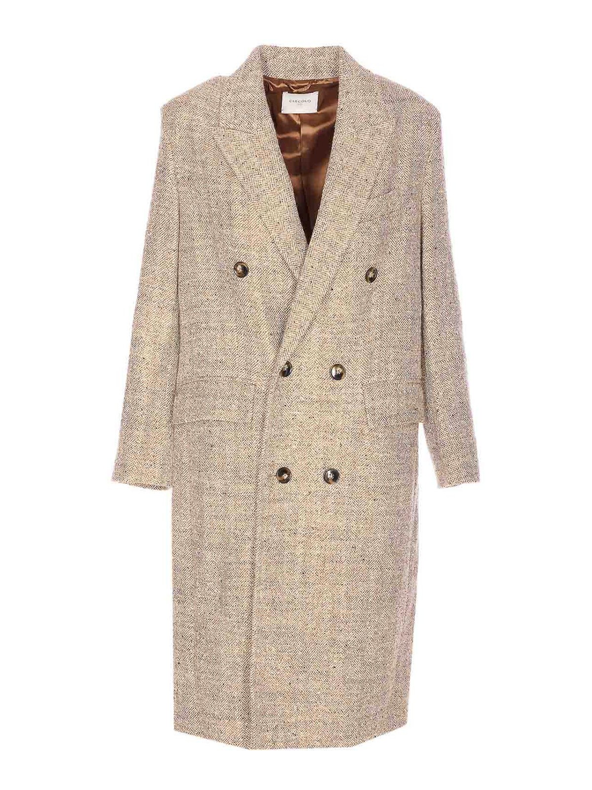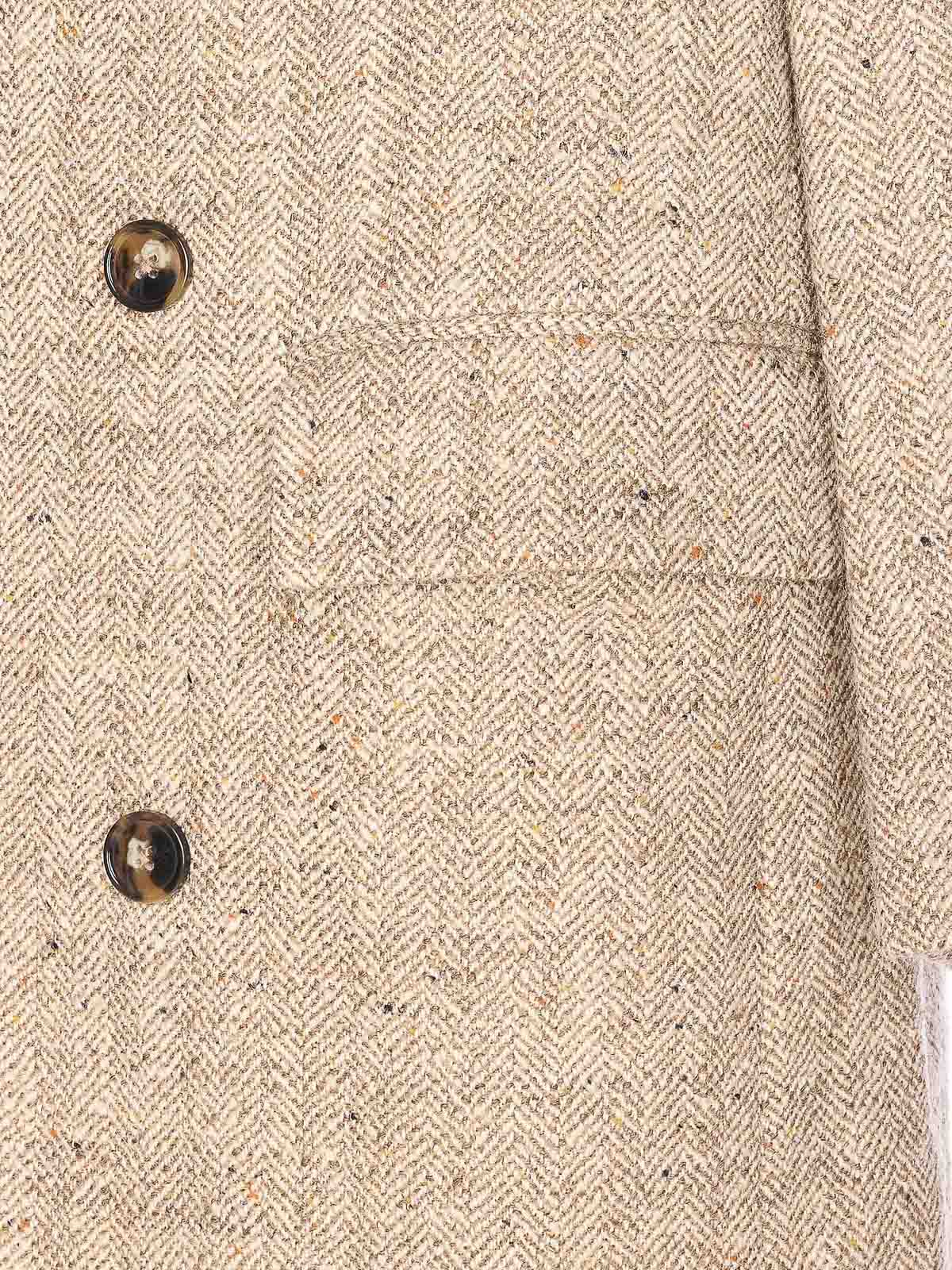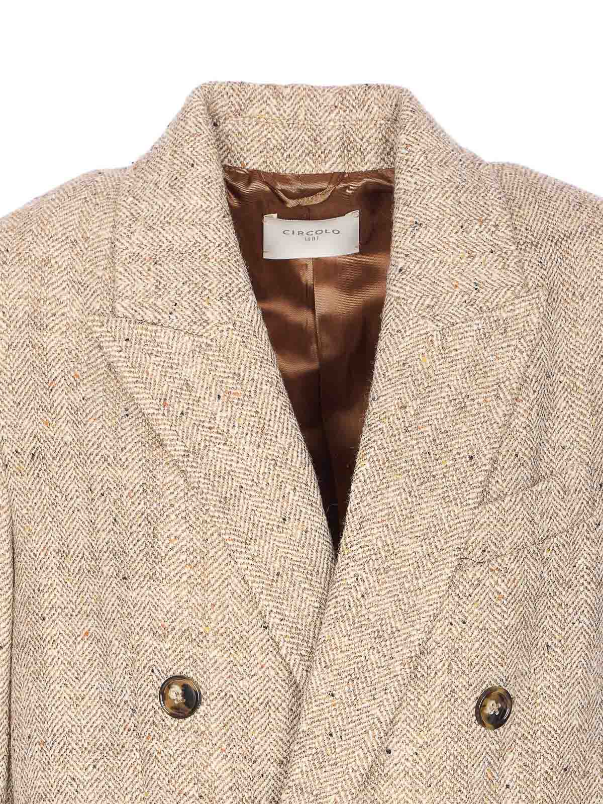 Cirolo 1901 beige coat, frontal double breasted buttons closure, long sleeves, pockets, v-neck, reverse detail, boucle' effect, reinforced shoulder