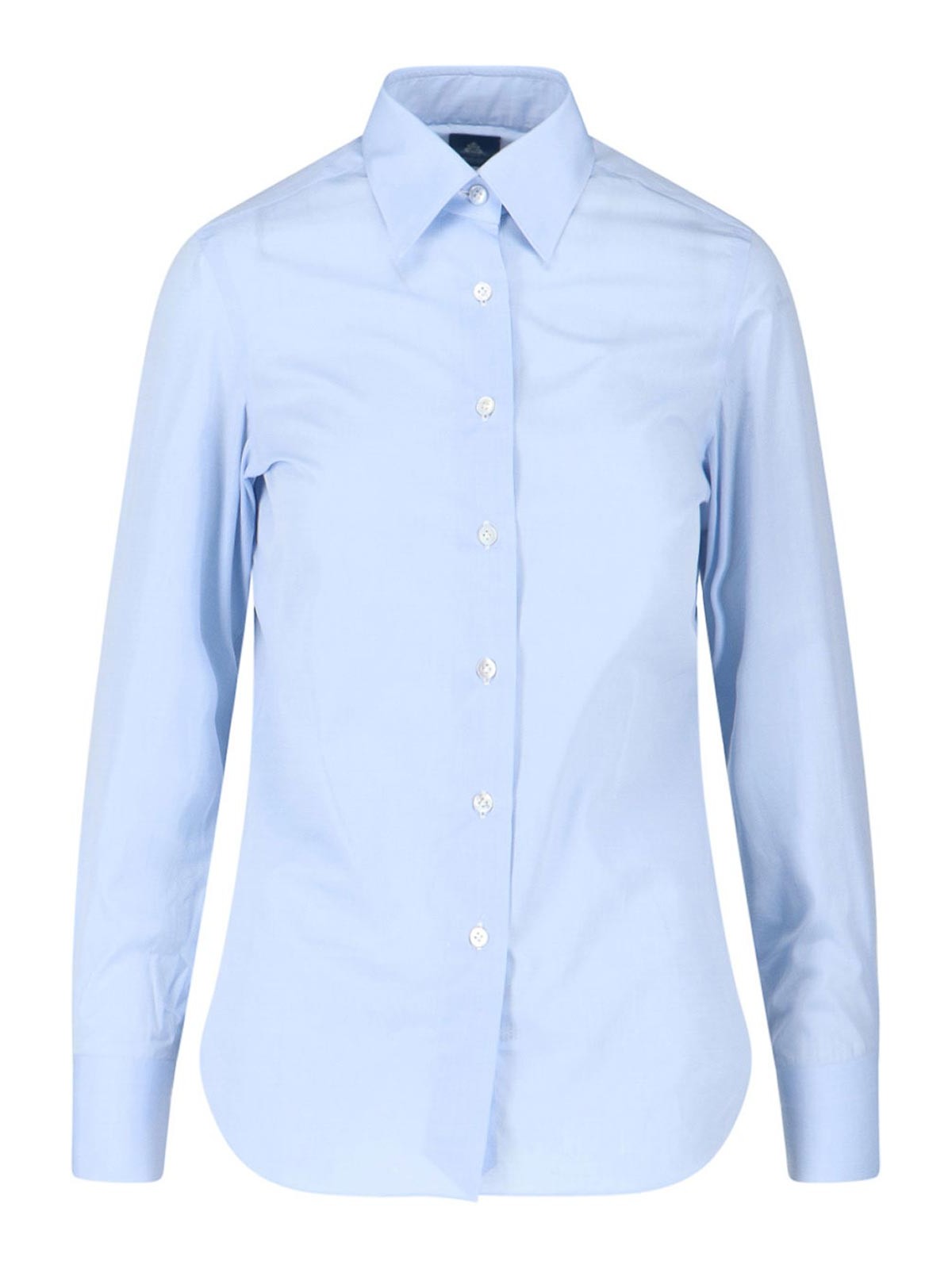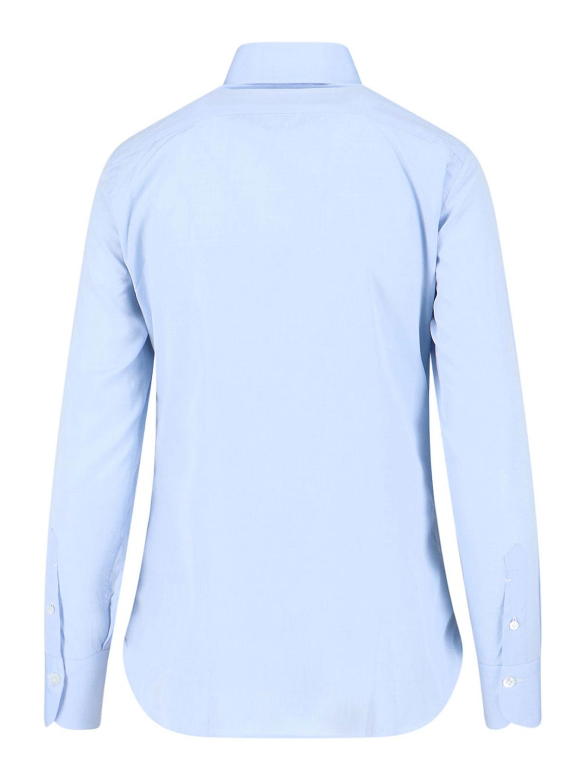 Classic Finamore 1925 shirt, in light blue cotton, classic collar, button closure, contrasting side logo embroidery, buttoned cuffs, curved hem.