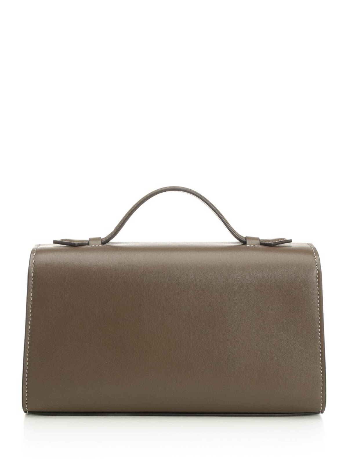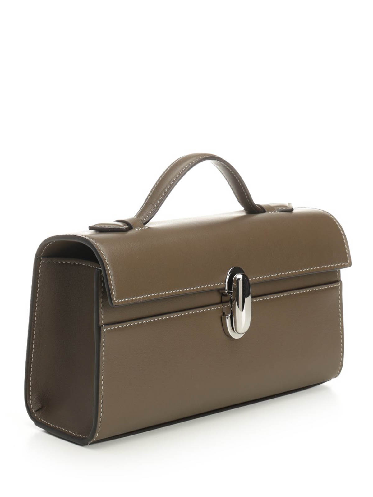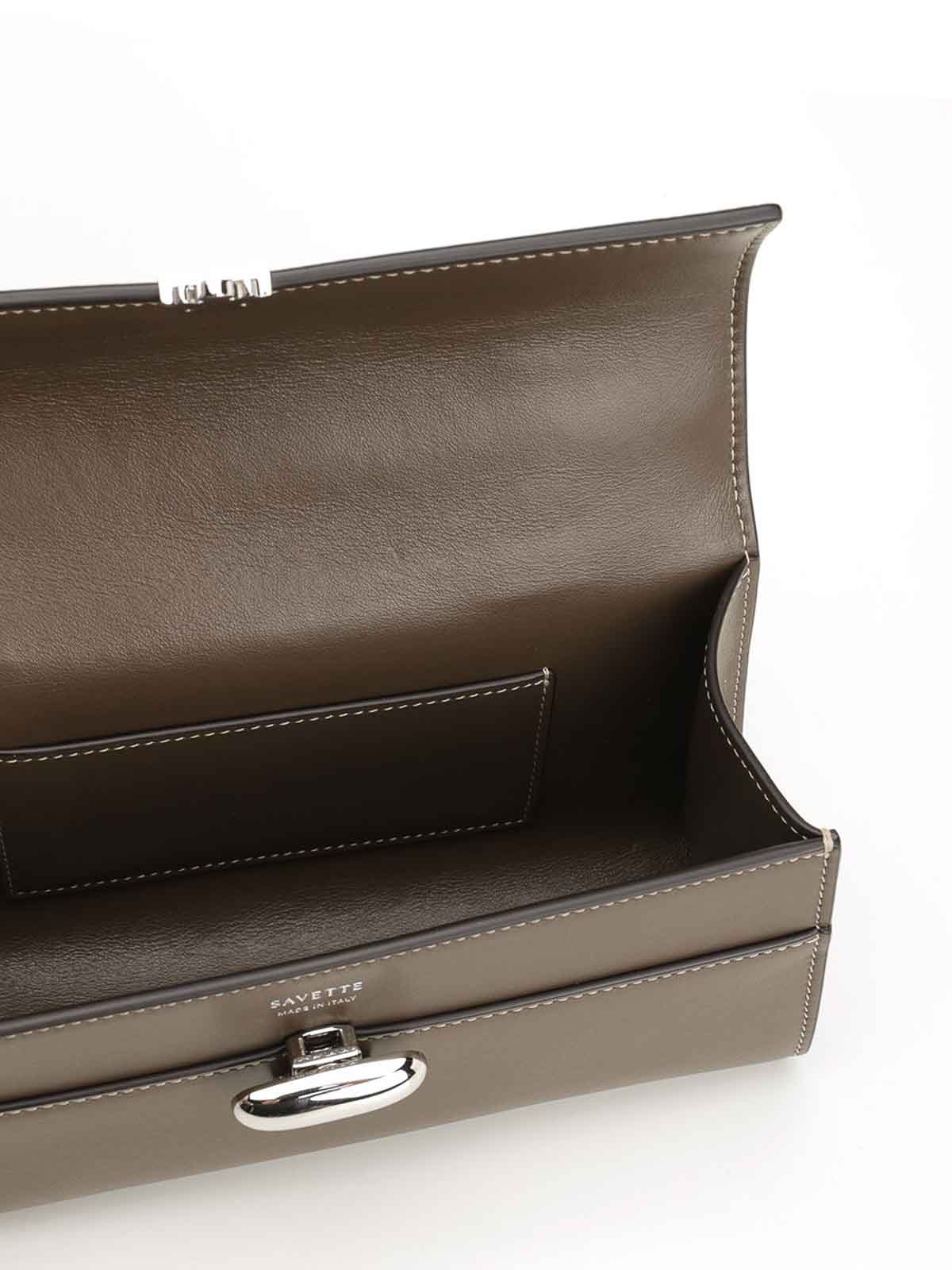 Savette symmetry clutch bag, with symmetry snap closure, an internal pocket and a leather handle.